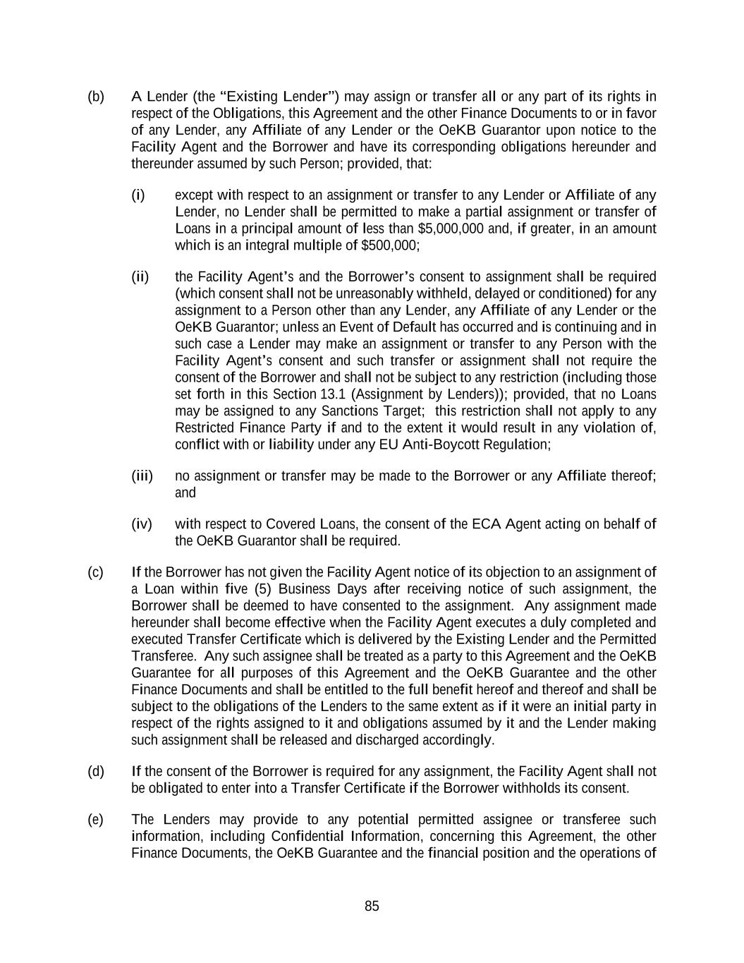 85 (b) A Lender (the “Existing Lender”) may assign or transfer all or any part of its rights in respect of the Obligations, this Agreement and the other Finance Documents to or in favor of any Lender, any Affiliate of any Lender or the OeKB Guarantor upon notice to the Facility Agent and the Borrower and have its corresponding obligations hereunder and thereunder assumed by such Person; provided, that: (i) except with respect to an assignment or transfer to any Lender or Affiliate of any Lender, no Lender shall be permitted to make a partial assignment or transfer of Loans in a principal amount of less than $5,000,000 and, if greater, in an amount which is an integral multiple of $500,000; (ii) the Facility Agent’s and the Borrower’s consent to assignment shall be required (which consent shall not be unreasonably withheld, delayed or conditioned) for any assignment to a Person other than any Lender, any Affiliate of any Lender or the OeKB Guarantor; unless an Event of Default has occurred and is continuing and in such case a Lender may make an assignment or transfer to any Person with the Facility Agent’s consent and such transfer or assignment shall not require the consent of the Borrower and shall not be subject to any restriction (including those set forth in this Section 13.1 (Assignment by Lenders)); provided, that no Loans may be assigned to any Sanctions Target; this restriction shall not apply to any Restricted Finance Party if and to the extent it would result in any violation of, conflict with or liability under any EU Anti-Boycott Regulation; (iii) no assignment or transfer may be made to the Borrower or any Affiliate thereof; and (iv) with respect to Covered Loans, the consent of the ECA Agent acting on behalf of the OeKB Guarantor shall be required. (c) If the Borrower has not given the Facility Agent notice of its objection to an assignment of a Loan within five (5) Business Days after receiving notice of such assignment, the Borrower shall be deemed to have consented to the assignment. Any assignment made hereunder shall become effective when the Facility Agent executes a duly completed and executed Transfer Certificate which is delivered by the Existing Lender and the Permitted Transferee. Any such assignee shall be treated as a party to this Agreement and the OeKB Guarantee for all purposes of this Agreement and the OeKB Guarantee and the other Finance Documents and shall be entitled to the full benefit hereof and thereof and shall be subject to the obligations of the Lenders to the same extent as if it were an initial party in respect of the rights assigned to it and obligations assumed by it and the Lender making such assignment shall be released and discharged accordingly. (d) If the consent of the Borrower is required for any assignment, the Facility Agent shall not be obligated to enter into a Transfer Certificate if the Borrower withholds its consent. (e) The Lenders may provide to any potential permitted assignee or transferee such information, including Confidential Information, concerning this Agreement, the other Finance Documents, the OeKB Guarantee and the financial position and the operations of