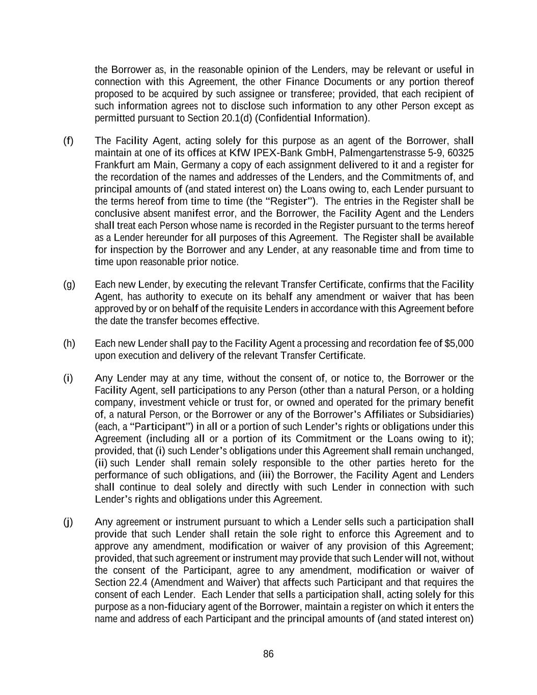 86 the Borrower as, in the reasonable opinion of the Lenders, may be relevant or useful in connection with this Agreement, the other Finance Documents or any portion thereof proposed to be acquired by such assignee or transferee; provided, that each recipient of such information agrees not to disclose such information to any other Person except as permitted pursuant to Section 20.1(d) (Confidential Information). (f) The Facility Agent, acting solely for this purpose as an agent of the Borrower, shall maintain at one of its offices at KfW IPEX-Bank GmbH, Palmengartenstrasse 5-9, 60325 Frankfurt am Main, Germany a copy of each assignment delivered to it and a register for the recordation of the names and addresses of the Lenders, and the Commitments of, and principal amounts of (and stated interest on) the Loans owing to, each Lender pursuant to the terms hereof from time to time (the “Register”). The entries in the Register shall be conclusive absent manifest error, and the Borrower, the Facility Agent and the Lenders shall treat each Person whose name is recorded in the Register pursuant to the terms hereof as a Lender hereunder for all purposes of this Agreement. The Register shall be available for inspection by the Borrower and any Lender, at any reasonable time and from time to time upon reasonable prior notice. (g) Each new Lender, by executing the relevant Transfer Certificate, confirms that the Facility Agent, has authority to execute on its behalf any amendment or waiver that has been approved by or on behalf of the requisite Lenders in accordance with this Agreement before the date the transfer becomes effective. (h) Each new Lender shall pay to the Facility Agent a processing and recordation fee of $5,000 upon execution and delivery of the relevant Transfer Certificate. (i) Any Lender may at any time, without the consent of, or notice to, the Borrower or the Facility Agent, sell participations to any Person (other than a natural Person, or a holding company, investment vehicle or trust for, or owned and operated for the primary benefit of, a natural Person, or the Borrower or any of the Borrower’s Affiliates or Subsidiaries) (each, a “Participant”) in all or a portion of such Lender’s rights or obligations under this Agreement (including all or a portion of its Commitment or the Loans owing to it); provided, that (i) such Lender’s obligations under this Agreement shall remain unchanged, (ii) such Lender shall remain solely responsible to the other parties hereto for the performance of such obligations, and (iii) the Borrower, the Facility Agent and Lenders shall continue to deal solely and directly with such Lender in connection with such Lender’s rights and obligations under this Agreement. (j) Any agreement or instrument pursuant to which a Lender sells such a participation shall provide that such Lender shall retain the sole right to enforce this Agreement and to approve any amendment, modification or waiver of any provision of this Agreement; provided, that such agreement or instrument may provide that such Lender will not, without the consent of the Participant, agree to any amendment, modification or waiver of Section 22.4 (Amendment and Waiver) that affects such Participant and that requires the consent of each Lender. Each Lender that sells a participation shall, acting solely for this purpose as a non-fiduciary agent of the Borrower, maintain a register on which it enters the name and address of each Participant and the principal amounts of (and stated interest on)