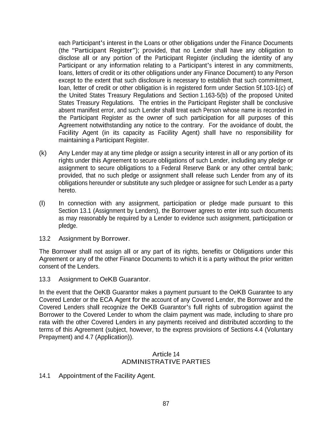 87 each Participant’s interest in the Loans or other obligations under the Finance Documents (the “Participant Register”); provided, that no Lender shall have any obligation to disclose all or any portion of the Participant Register (including the identity of any Participant or any information relating to a Participant’s interest in any commitments, loans, letters of credit or its other obligations under any Finance Document) to any Person except to the extent that such disclosure is necessary to establish that such commitment, loan, letter of credit or other obligation is in registered form under Section 5f.103-1(c) of the United States Treasury Regulations and Section 1.163-5(b) of the proposed United States Treasury Regulations. The entries in the Participant Register shall be conclusive absent manifest error, and such Lender shall treat each Person whose name is recorded in the Participant Register as the owner of such participation for all purposes of this Agreement notwithstanding any notice to the contrary. For the avoidance of doubt, the Facility Agent (in its capacity as Facility Agent) shall have no responsibility for maintaining a Participant Register. (k) Any Lender may at any time pledge or assign a security interest in all or any portion of its rights under this Agreement to secure obligations of such Lender, including any pledge or assignment to secure obligations to a Federal Reserve Bank or any other central bank; provided, that no such pledge or assignment shall release such Lender from any of its obligations hereunder or substitute any such pledgee or assignee for such Lender as a party hereto. (l) In connection with any assignment, participation or pledge made pursuant to this Section 13.1 (Assignment by Lenders), the Borrower agrees to enter into such documents as may reasonably be required by a Lender to evidence such assignment, participation or pledge. 13.2 Assignment by Borrower. The Borrower shall not assign all or any part of its rights, benefits or Obligations under this Agreement or any of the other Finance Documents to which it is a party without the prior written consent of the Lenders. 13.3 Assignment to OeKB Guarantor. In the event that the OeKB Guarantor makes a payment pursuant to the OeKB Guarantee to any Covered Lender or the ECA Agent for the account of any Covered Lender, the Borrower and the Covered Lenders shall recognize the OeKB Guarantor’s full rights of subrogation against the Borrower to the Covered Lender to whom the claim payment was made, including to share pro rata with the other Covered Lenders in any payments received and distributed according to the terms of this Agreement (subject, however, to the express provisions of Sections 4.4 (Voluntary Prepayment) and 4.7 (Application)). Article 14 ADMINISTRATIVE PARTIES 14.1 Appointment of the Facility Agent.