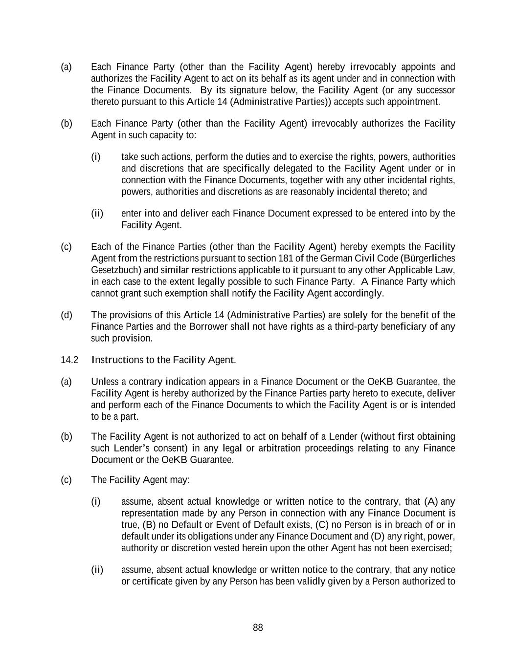 88 (a) Each Finance Party (other than the Facility Agent) hereby irrevocably appoints and authorizes the Facility Agent to act on its behalf as its agent under and in connection with the Finance Documents. By its signature below, the Facility Agent (or any successor thereto pursuant to this Article 14 (Administrative Parties)) accepts such appointment. (b) Each Finance Party (other than the Facility Agent) irrevocably authorizes the Facility Agent in such capacity to: (i) take such actions, perform the duties and to exercise the rights, powers, authorities and discretions that are specifically delegated to the Facility Agent under or in connection with the Finance Documents, together with any other incidental rights, powers, authorities and discretions as are reasonably incidental thereto; and (ii) enter into and deliver each Finance Document expressed to be entered into by the Facility Agent. (c) Each of the Finance Parties (other than the Facility Agent) hereby exempts the Facility Agent from the restrictions pursuant to section 181 of the German Civil Code (Bürgerliches Gesetzbuch) and similar restrictions applicable to it pursuant to any other Applicable Law, in each case to the extent legally possible to such Finance Party. A Finance Party which cannot grant such exemption shall notify the Facility Agent accordingly. (d) The provisions of this Article 14 (Administrative Parties) are solely for the benefit of the Finance Parties and the Borrower shall not have rights as a third-party beneficiary of any such provision. 14.2 Instructions to the Facility Agent. (a) Unless a contrary indication appears in a Finance Document or the OeKB Guarantee, the Facility Agent is hereby authorized by the Finance Parties party hereto to execute, deliver and perform each of the Finance Documents to which the Facility Agent is or is intended to be a part. (b) The Facility Agent is not authorized to act on behalf of a Lender (without first obtaining such Lender’s consent) in any legal or arbitration proceedings relating to any Finance Document or the OeKB Guarantee. (c) The Facility Agent may: (i) assume, absent actual knowledge or written notice to the contrary, that (A) any representation made by any Person in connection with any Finance Document is true, (B) no Default or Event of Default exists, (C) no Person is in breach of or in default under its obligations under any Finance Document and (D) any right, power, authority or discretion vested herein upon the other Agent has not been exercised; (ii) assume, absent actual knowledge or written notice to the contrary, that any notice or certificate given by any Person has been validly given by a Person authorized to