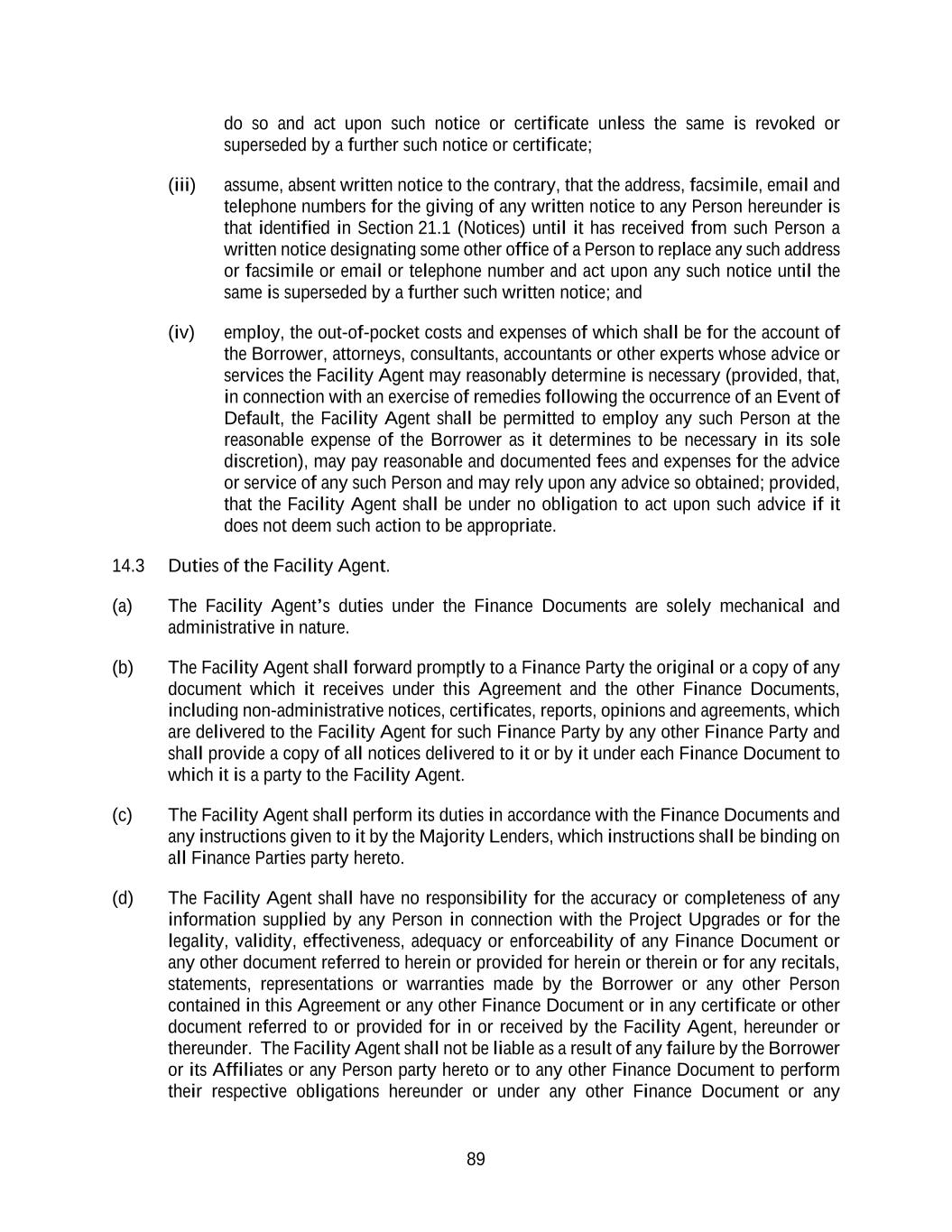 89 do so and act upon such notice or certificate unless the same is revoked or superseded by a further such notice or certificate; (iii) assume, absent written notice to the contrary, that the address, facsimile, email and telephone numbers for the giving of any written notice to any Person hereunder is that identified in Section 21.1 (Notices) until it has received from such Person a written notice designating some other office of a Person to replace any such address or facsimile or email or telephone number and act upon any such notice until the same is superseded by a further such written notice; and (iv) employ, the out-of-pocket costs and expenses of which shall be for the account of the Borrower, attorneys, consultants, accountants or other experts whose advice or services the Facility Agent may reasonably determine is necessary (provided, that, in connection with an exercise of remedies following the occurrence of an Event of Default, the Facility Agent shall be permitted to employ any such Person at the reasonable expense of the Borrower as it determines to be necessary in its sole discretion), may pay reasonable and documented fees and expenses for the advice or service of any such Person and may rely upon any advice so obtained; provided, that the Facility Agent shall be under no obligation to act upon such advice if it does not deem such action to be appropriate. 14.3 Duties of the Facility Agent. (a) The Facility Agent’s duties under the Finance Documents are solely mechanical and administrative in nature. (b) The Facility Agent shall forward promptly to a Finance Party the original or a copy of any document which it receives under this Agreement and the other Finance Documents, including non-administrative notices, certificates, reports, opinions and agreements, which are delivered to the Facility Agent for such Finance Party by any other Finance Party and shall provide a copy of all notices delivered to it or by it under each Finance Document to which it is a party to the Facility Agent. (c) The Facility Agent shall perform its duties in accordance with the Finance Documents and any instructions given to it by the Majority Lenders, which instructions shall be binding on all Finance Parties party hereto. (d) The Facility Agent shall have no responsibility for the accuracy or completeness of any information supplied by any Person in connection with the Project Upgrades or for the legality, validity, effectiveness, adequacy or enforceability of any Finance Document or any other document referred to herein or provided for herein or therein or for any recitals, statements, representations or warranties made by the Borrower or any other Person contained in this Agreement or any other Finance Document or in any certificate or other document referred to or provided for in or received by the Facility Agent, hereunder or thereunder. The Facility Agent shall not be liable as a result of any failure by the Borrower or its Affiliates or any Person party hereto or to any other Finance Document to perform their respective obligations hereunder or under any other Finance Document or any