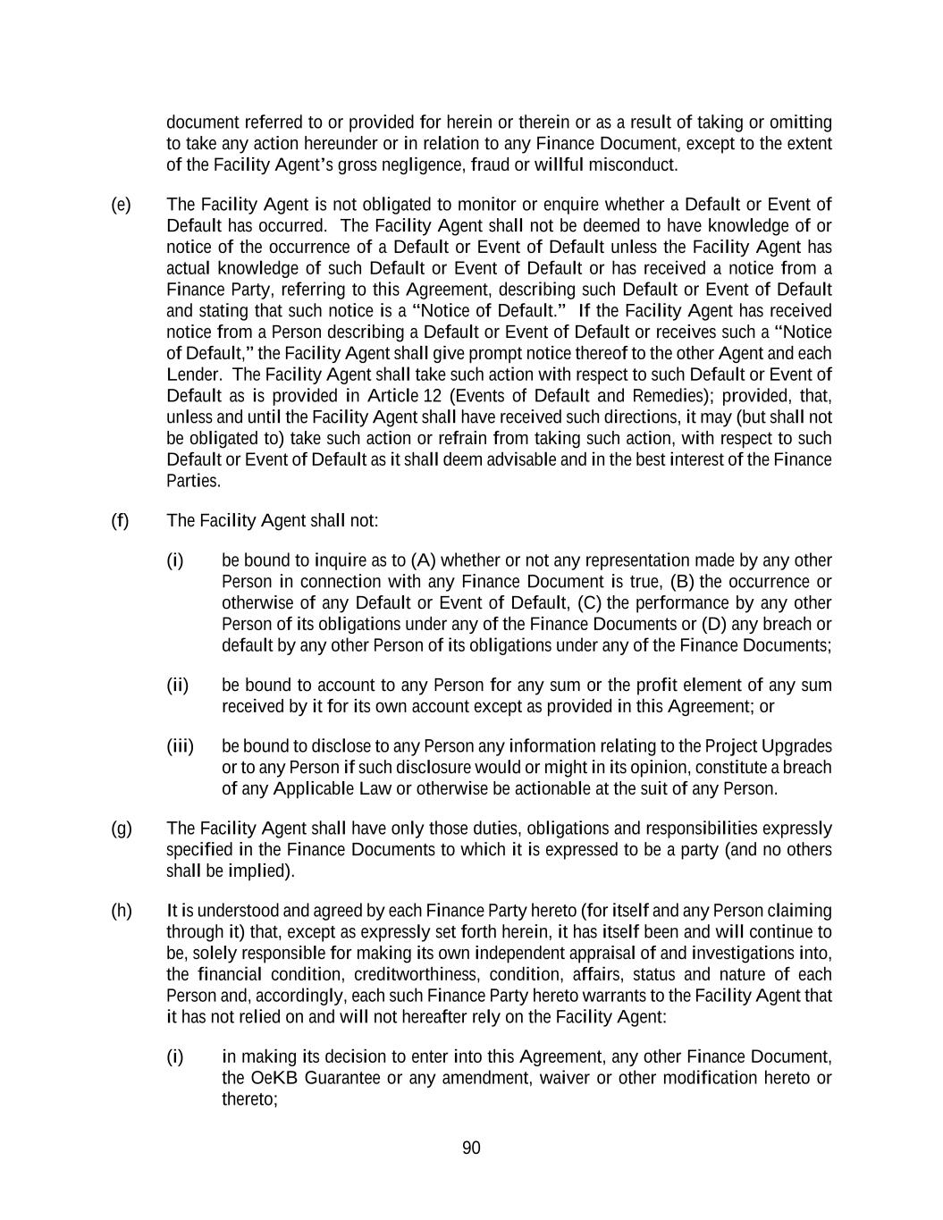 90 document referred to or provided for herein or therein or as a result of taking or omitting to take any action hereunder or in relation to any Finance Document, except to the extent of the Facility Agent’s gross negligence, fraud or willful misconduct. (e) The Facility Agent is not obligated to monitor or enquire whether a Default or Event of Default has occurred. The Facility Agent shall not be deemed to have knowledge of or notice of the occurrence of a Default or Event of Default unless the Facility Agent has actual knowledge of such Default or Event of Default or has received a notice from a Finance Party, referring to this Agreement, describing such Default or Event of Default and stating that such notice is a “Notice of Default.” If the Facility Agent has received notice from a Person describing a Default or Event of Default or receives such a “Notice of Default,” the Facility Agent shall give prompt notice thereof to the other Agent and each Lender. The Facility Agent shall take such action with respect to such Default or Event of Default as is provided in Article 12 (Events of Default and Remedies); provided, that, unless and until the Facility Agent shall have received such directions, it may (but shall not be obligated to) take such action or refrain from taking such action, with respect to such Default or Event of Default as it shall deem advisable and in the best interest of the Finance Parties. (f) The Facility Agent shall not: (i) be bound to inquire as to (A) whether or not any representation made by any other Person in connection with any Finance Document is true, (B) the occurrence or otherwise of any Default or Event of Default, (C) the performance by any other Person of its obligations under any of the Finance Documents or (D) any breach or default by any other Person of its obligations under any of the Finance Documents; (ii) be bound to account to any Person for any sum or the profit element of any sum received by it for its own account except as provided in this Agreement; or (iii) be bound to disclose to any Person any information relating to the Project Upgrades or to any Person if such disclosure would or might in its opinion, constitute a breach of any Applicable Law or otherwise be actionable at the suit of any Person. (g) The Facility Agent shall have only those duties, obligations and responsibilities expressly specified in the Finance Documents to which it is expressed to be a party (and no others shall be implied). (h) It is understood and agreed by each Finance Party hereto (for itself and any Person claiming through it) that, except as expressly set forth herein, it has itself been and will continue to be, solely responsible for making its own independent appraisal of and investigations into, the financial condition, creditworthiness, condition, affairs, status and nature of each Person and, accordingly, each such Finance Party hereto warrants to the Facility Agent that it has not relied on and will not hereafter rely on the Facility Agent: (i) in making its decision to enter into this Agreement, any other Finance Document, the OeKB Guarantee or any amendment, waiver or other modification hereto or thereto;