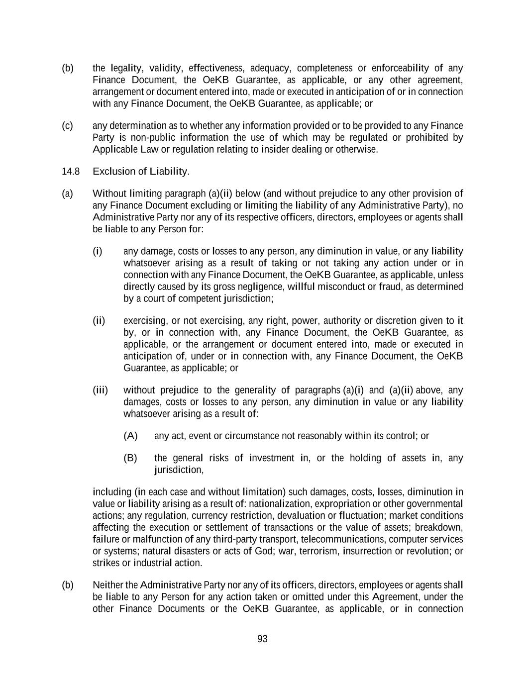 93 (b) the legality, validity, effectiveness, adequacy, completeness or enforceability of any Finance Document, the OeKB Guarantee, as applicable, or any other agreement, arrangement or document entered into, made or executed in anticipation of or in connection with any Finance Document, the OeKB Guarantee, as applicable; or (c) any determination as to whether any information provided or to be provided to any Finance Party is non-public information the use of which may be regulated or prohibited by Applicable Law or regulation relating to insider dealing or otherwise. 14.8 Exclusion of Liability. (a) Without limiting paragraph (a)(ii) below (and without prejudice to any other provision of any Finance Document excluding or limiting the liability of any Administrative Party), no Administrative Party nor any of its respective officers, directors, employees or agents shall be liable to any Person for: (i) any damage, costs or losses to any person, any diminution in value, or any liability whatsoever arising as a result of taking or not taking any action under or in connection with any Finance Document, the OeKB Guarantee, as applicable, unless directly caused by its gross negligence, willful misconduct or fraud, as determined by a court of competent jurisdiction; (ii) exercising, or not exercising, any right, power, authority or discretion given to it by, or in connection with, any Finance Document, the OeKB Guarantee, as applicable, or the arrangement or document entered into, made or executed in anticipation of, under or in connection with, any Finance Document, the OeKB Guarantee, as applicable; or (iii) without prejudice to the generality of paragraphs (a)(i) and (a)(ii) above, any damages, costs or losses to any person, any diminution in value or any liability whatsoever arising as a result of: (A) any act, event or circumstance not reasonably within its control; or (B) the general risks of investment in, or the holding of assets in, any jurisdiction, including (in each case and without limitation) such damages, costs, losses, diminution in value or liability arising as a result of: nationalization, expropriation or other governmental actions; any regulation, currency restriction, devaluation or fluctuation; market conditions affecting the execution or settlement of transactions or the value of assets; breakdown, failure or malfunction of any third-party transport, telecommunications, computer services or systems; natural disasters or acts of God; war, terrorism, insurrection or revolution; or strikes or industrial action. (b) Neither the Administrative Party nor any of its officers, directors, employees or agents shall be liable to any Person for any action taken or omitted under this Agreement, under the other Finance Documents or the OeKB Guarantee, as applicable, or in connection