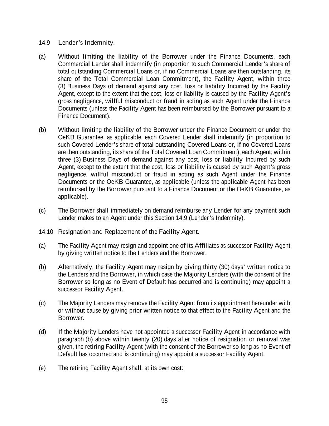 95 14.9 Lender’s Indemnity. (a) Without limiting the liability of the Borrower under the Finance Documents, each Commercial Lender shall indemnify (in proportion to such Commercial Lender’s share of total outstanding Commercial Loans or, if no Commercial Loans are then outstanding, its share of the Total Commercial Loan Commitment), the Facility Agent, within three (3) Business Days of demand against any cost, loss or liability Incurred by the Facility Agent, except to the extent that the cost, loss or liability is caused by the Facility Agent’s gross negligence, willful misconduct or fraud in acting as such Agent under the Finance Documents (unless the Facility Agent has been reimbursed by the Borrower pursuant to a Finance Document). (b) Without limiting the liability of the Borrower under the Finance Document or under the OeKB Guarantee, as applicable, each Covered Lender shall indemnify (in proportion to such Covered Lender’s share of total outstanding Covered Loans or, if no Covered Loans are then outstanding, its share of the Total Covered Loan Commitment), each Agent, within three (3) Business Days of demand against any cost, loss or liability Incurred by such Agent, except to the extent that the cost, loss or liability is caused by such Agent’s gross negligence, willful misconduct or fraud in acting as such Agent under the Finance Documents or the OeKB Guarantee, as applicable (unless the applicable Agent has been reimbursed by the Borrower pursuant to a Finance Document or the OeKB Guarantee, as applicable). (c) The Borrower shall immediately on demand reimburse any Lender for any payment such Lender makes to an Agent under this Section 14.9 (Lender’s Indemnity). 14.10 Resignation and Replacement of the Facility Agent. (a) The Facility Agent may resign and appoint one of its Affiliates as successor Facility Agent by giving written notice to the Lenders and the Borrower. (b) Alternatively, the Facility Agent may resign by giving thirty (30) days’ written notice to the Lenders and the Borrower, in which case the Majority Lenders (with the consent of the Borrower so long as no Event of Default has occurred and is continuing) may appoint a successor Facility Agent. (c) The Majority Lenders may remove the Facility Agent from its appointment hereunder with or without cause by giving prior written notice to that effect to the Facility Agent and the Borrower. (d) If the Majority Lenders have not appointed a successor Facility Agent in accordance with paragraph (b) above within twenty (20) days after notice of resignation or removal was given, the retiring Facility Agent (with the consent of the Borrower so long as no Event of Default has occurred and is continuing) may appoint a successor Facility Agent. (e) The retiring Facility Agent shall, at its own cost: