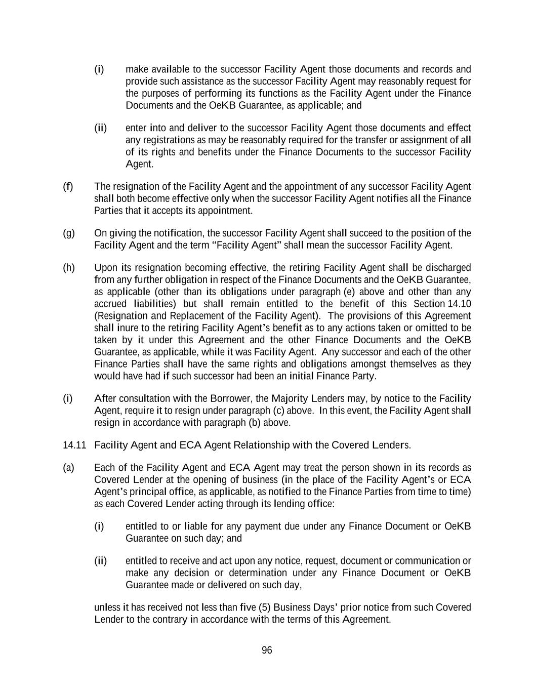 96 (i) make available to the successor Facility Agent those documents and records and provide such assistance as the successor Facility Agent may reasonably request for the purposes of performing its functions as the Facility Agent under the Finance Documents and the OeKB Guarantee, as applicable; and (ii) enter into and deliver to the successor Facility Agent those documents and effect any registrations as may be reasonably required for the transfer or assignment of all of its rights and benefits under the Finance Documents to the successor Facility Agent. (f) The resignation of the Facility Agent and the appointment of any successor Facility Agent shall both become effective only when the successor Facility Agent notifies all the Finance Parties that it accepts its appointment. (g) On giving the notification, the successor Facility Agent shall succeed to the position of the Facility Agent and the term “Facility Agent” shall mean the successor Facility Agent. (h) Upon its resignation becoming effective, the retiring Facility Agent shall be discharged from any further obligation in respect of the Finance Documents and the OeKB Guarantee, as applicable (other than its obligations under paragraph (e) above and other than any accrued liabilities) but shall remain entitled to the benefit of this Section 14.10 (Resignation and Replacement of the Facility Agent). The provisions of this Agreement shall inure to the retiring Facility Agent’s benefit as to any actions taken or omitted to be taken by it under this Agreement and the other Finance Documents and the OeKB Guarantee, as applicable, while it was Facility Agent. Any successor and each of the other Finance Parties shall have the same rights and obligations amongst themselves as they would have had if such successor had been an initial Finance Party. (i) After consultation with the Borrower, the Majority Lenders may, by notice to the Facility Agent, require it to resign under paragraph (c) above. In this event, the Facility Agent shall resign in accordance with paragraph (b) above. 14.11 Facility Agent and ECA Agent Relationship with the Covered Lenders. (a) Each of the Facility Agent and ECA Agent may treat the person shown in its records as Covered Lender at the opening of business (in the place of the Facility Agent’s or ECA Agent’s principal office, as applicable, as notified to the Finance Parties from time to time) as each Covered Lender acting through its lending office: (i) entitled to or liable for any payment due under any Finance Document or OeKB Guarantee on such day; and (ii) entitled to receive and act upon any notice, request, document or communication or make any decision or determination under any Finance Document or OeKB Guarantee made or delivered on such day, unless it has received not less than five (5) Business Days’ prior notice from such Covered Lender to the contrary in accordance with the terms of this Agreement.