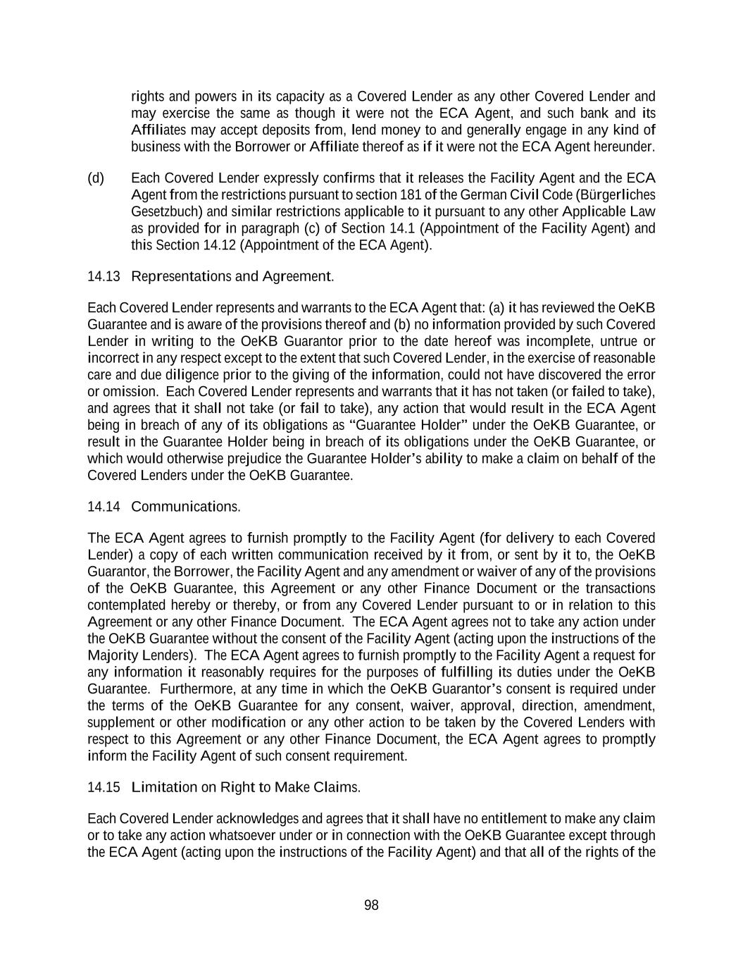98 rights and powers in its capacity as a Covered Lender as any other Covered Lender and may exercise the same as though it were not the ECA Agent, and such bank and its Affiliates may accept deposits from, lend money to and generally engage in any kind of business with the Borrower or Affiliate thereof as if it were not the ECA Agent hereunder. (d) Each Covered Lender expressly confirms that it releases the Facility Agent and the ECA Agent from the restrictions pursuant to section 181 of the German Civil Code (Bürgerliches Gesetzbuch) and similar restrictions applicable to it pursuant to any other Applicable Law as provided for in paragraph (c) of Section 14.1 (Appointment of the Facility Agent) and this Section 14.12 (Appointment of the ECA Agent). 14.13 Representations and Agreement. Each Covered Lender represents and warrants to the ECA Agent that: (a) it has reviewed the OeKB Guarantee and is aware of the provisions thereof and (b) no information provided by such Covered Lender in writing to the OeKB Guarantor prior to the date hereof was incomplete, untrue or incorrect in any respect except to the extent that such Covered Lender, in the exercise of reasonable care and due diligence prior to the giving of the information, could not have discovered the error or omission. Each Covered Lender represents and warrants that it has not taken (or failed to take), and agrees that it shall not take (or fail to take), any action that would result in the ECA Agent being in breach of any of its obligations as “Guarantee Holder” under the OeKB Guarantee, or result in the Guarantee Holder being in breach of its obligations under the OeKB Guarantee, or which would otherwise prejudice the Guarantee Holder’s ability to make a claim on behalf of the Covered Lenders under the OeKB Guarantee. 14.14 Communications. The ECA Agent agrees to furnish promptly to the Facility Agent (for delivery to each Covered Lender) a copy of each written communication received by it from, or sent by it to, the OeKB Guarantor, the Borrower, the Facility Agent and any amendment or waiver of any of the provisions of the OeKB Guarantee, this Agreement or any other Finance Document or the transactions contemplated hereby or thereby, or from any Covered Lender pursuant to or in relation to this Agreement or any other Finance Document. The ECA Agent agrees not to take any action under the OeKB Guarantee without the consent of the Facility Agent (acting upon the instructions of the Majority Lenders). The ECA Agent agrees to furnish promptly to the Facility Agent a request for any information it reasonably requires for the purposes of fulfilling its duties under the OeKB Guarantee. Furthermore, at any time in which the OeKB Guarantor’s consent is required under the terms of the OeKB Guarantee for any consent, waiver, approval, direction, amendment, supplement or other modification or any other action to be taken by the Covered Lenders with respect to this Agreement or any other Finance Document, the ECA Agent agrees to promptly inform the Facility Agent of such consent requirement. 14.15 Limitation on Right to Make Claims. Each Covered Lender acknowledges and agrees that it shall have no entitlement to make any claim or to take any action whatsoever under or in connection with the OeKB Guarantee except through the ECA Agent (acting upon the instructions of the Facility Agent) and that all of the rights of the