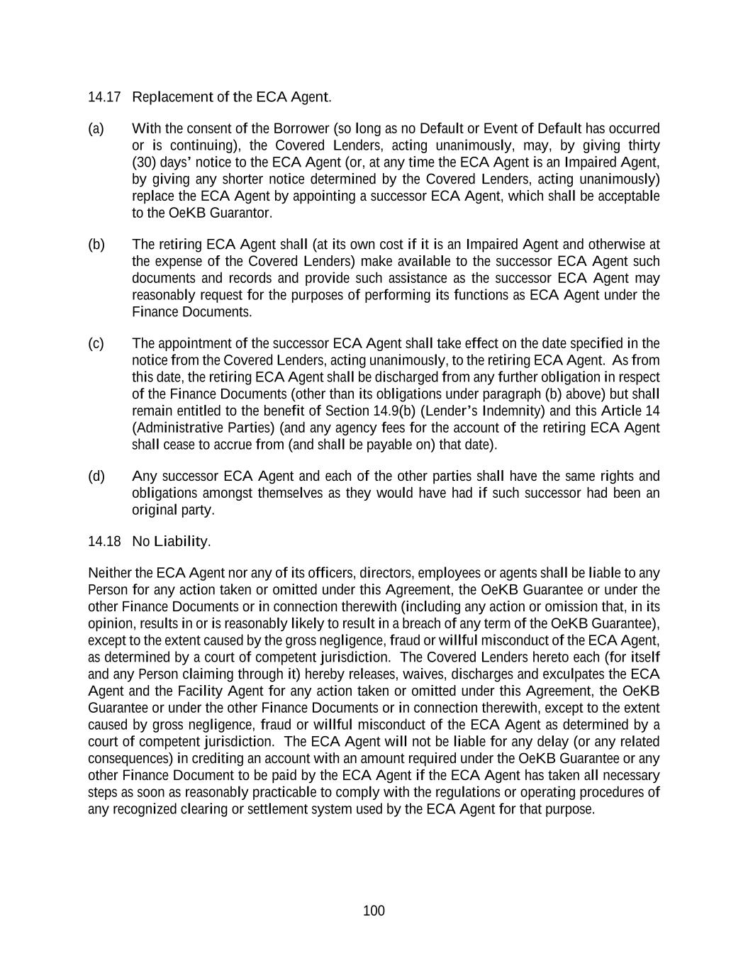 100 14.17 Replacement of the ECA Agent. (a) With the consent of the Borrower (so long as no Default or Event of Default has occurred or is continuing), the Covered Lenders, acting unanimously, may, by giving thirty (30) days’ notice to the ECA Agent (or, at any time the ECA Agent is an Impaired Agent, by giving any shorter notice determined by the Covered Lenders, acting unanimously) replace the ECA Agent by appointing a successor ECA Agent, which shall be acceptable to the OeKB Guarantor. (b) The retiring ECA Agent shall (at its own cost if it is an Impaired Agent and otherwise at the expense of the Covered Lenders) make available to the successor ECA Agent such documents and records and provide such assistance as the successor ECA Agent may reasonably request for the purposes of performing its functions as ECA Agent under the Finance Documents. (c) The appointment of the successor ECA Agent shall take effect on the date specified in the notice from the Covered Lenders, acting unanimously, to the retiring ECA Agent. As from this date, the retiring ECA Agent shall be discharged from any further obligation in respect of the Finance Documents (other than its obligations under paragraph (b) above) but shall remain entitled to the benefit of Section 14.9(b) (Lender’s Indemnity) and this Article 14 (Administrative Parties) (and any agency fees for the account of the retiring ECA Agent shall cease to accrue from (and shall be payable on) that date). (d) Any successor ECA Agent and each of the other parties shall have the same rights and obligations amongst themselves as they would have had if such successor had been an original party. 14.18 No Liability. Neither the ECA Agent nor any of its officers, directors, employees or agents shall be liable to any Person for any action taken or omitted under this Agreement, the OeKB Guarantee or under the other Finance Documents or in connection therewith (including any action or omission that, in its opinion, results in or is reasonably likely to result in a breach of any term of the OeKB Guarantee), except to the extent caused by the gross negligence, fraud or willful misconduct of the ECA Agent, as determined by a court of competent jurisdiction. The Covered Lenders hereto each (for itself and any Person claiming through it) hereby releases, waives, discharges and exculpates the ECA Agent and the Facility Agent for any action taken or omitted under this Agreement, the OeKB Guarantee or under the other Finance Documents or in connection therewith, except to the extent caused by gross negligence, fraud or willful misconduct of the ECA Agent as determined by a court of competent jurisdiction. The ECA Agent will not be liable for any delay (or any related consequences) in crediting an account with an amount required under the OeKB Guarantee or any other Finance Document to be paid by the ECA Agent if the ECA Agent has taken all necessary steps as soon as reasonably practicable to comply with the regulations or operating procedures of any recognized clearing or settlement system used by the ECA Agent for that purpose.