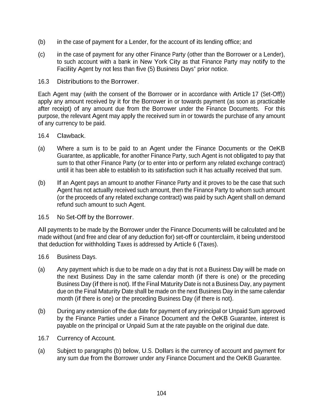 104 (b) in the case of payment for a Lender, for the account of its lending office; and (c) in the case of payment for any other Finance Party (other than the Borrower or a Lender), to such account with a bank in New York City as that Finance Party may notify to the Facility Agent by not less than five (5) Business Days’ prior notice. 16.3 Distributions to the Borrower. Each Agent may (with the consent of the Borrower or in accordance with Article 17 (Set-Off)) apply any amount received by it for the Borrower in or towards payment (as soon as practicable after receipt) of any amount due from the Borrower under the Finance Documents. For this purpose, the relevant Agent may apply the received sum in or towards the purchase of any amount of any currency to be paid. 16.4 Clawback. (a) Where a sum is to be paid to an Agent under the Finance Documents or the OeKB Guarantee, as applicable, for another Finance Party, such Agent is not obligated to pay that sum to that other Finance Party (or to enter into or perform any related exchange contract) until it has been able to establish to its satisfaction such it has actually received that sum. (b) If an Agent pays an amount to another Finance Party and it proves to be the case that such Agent has not actually received such amount, then the Finance Party to whom such amount (or the proceeds of any related exchange contract) was paid by such Agent shall on demand refund such amount to such Agent. 16.5 No Set-Off by the Borrower. All payments to be made by the Borrower under the Finance Documents will be calculated and be made without (and free and clear of any deduction for) set-off or counterclaim, it being understood that deduction for withholding Taxes is addressed by Article 6 (Taxes). 16.6 Business Days. (a) Any payment which is due to be made on a day that is not a Business Day will be made on the next Business Day in the same calendar month (if there is one) or the preceding Business Day (if there is not). If the Final Maturity Date is not a Business Day, any payment due on the Final Maturity Date shall be made on the next Business Day in the same calendar month (if there is one) or the preceding Business Day (if there is not). (b) During any extension of the due date for payment of any principal or Unpaid Sum approved by the Finance Parties under a Finance Document and the OeKB Guarantee, interest is payable on the principal or Unpaid Sum at the rate payable on the original due date. 16.7 Currency of Account. (a) Subject to paragraphs (b) below, U.S. Dollars is the currency of account and payment for any sum due from the Borrower under any Finance Document and the OeKB Guarantee.