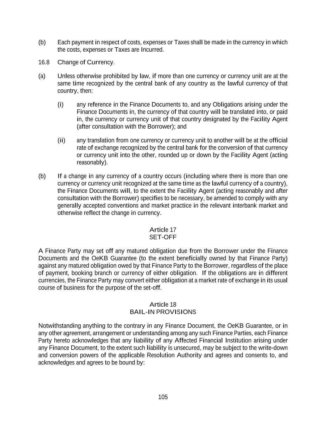 105 (b) Each payment in respect of costs, expenses or Taxes shall be made in the currency in which the costs, expenses or Taxes are Incurred. 16.8 Change of Currency. (a) Unless otherwise prohibited by law, if more than one currency or currency unit are at the same time recognized by the central bank of any country as the lawful currency of that country, then: (i) any reference in the Finance Documents to, and any Obligations arising under the Finance Documents in, the currency of that country will be translated into, or paid in, the currency or currency unit of that country designated by the Facility Agent (after consultation with the Borrower); and (ii) any translation from one currency or currency unit to another will be at the official rate of exchange recognized by the central bank for the conversion of that currency or currency unit into the other, rounded up or down by the Facility Agent (acting reasonably). (b) If a change in any currency of a country occurs (including where there is more than one currency or currency unit recognized at the same time as the lawful currency of a country), the Finance Documents will, to the extent the Facility Agent (acting reasonably and after consultation with the Borrower) specifies to be necessary, be amended to comply with any generally accepted conventions and market practice in the relevant interbank market and otherwise reflect the change in currency. Article 17 SET-OFF A Finance Party may set off any matured obligation due from the Borrower under the Finance Documents and the OeKB Guarantee (to the extent beneficially owned by that Finance Party) against any matured obligation owed by that Finance Party to the Borrower, regardless of the place of payment, booking branch or currency of either obligation. If the obligations are in different currencies, the Finance Party may convert either obligation at a market rate of exchange in its usual course of business for the purpose of the set-off. Article 18 BAIL-IN PROVISIONS Notwithstanding anything to the contrary in any Finance Document, the OeKB Guarantee, or in any other agreement, arrangement or understanding among any such Finance Parties, each Finance Party hereto acknowledges that any liability of any Affected Financial Institution arising under any Finance Document, to the extent such liability is unsecured, may be subject to the write-down and conversion powers of the applicable Resolution Authority and agrees and consents to, and acknowledges and agrees to be bound by:
