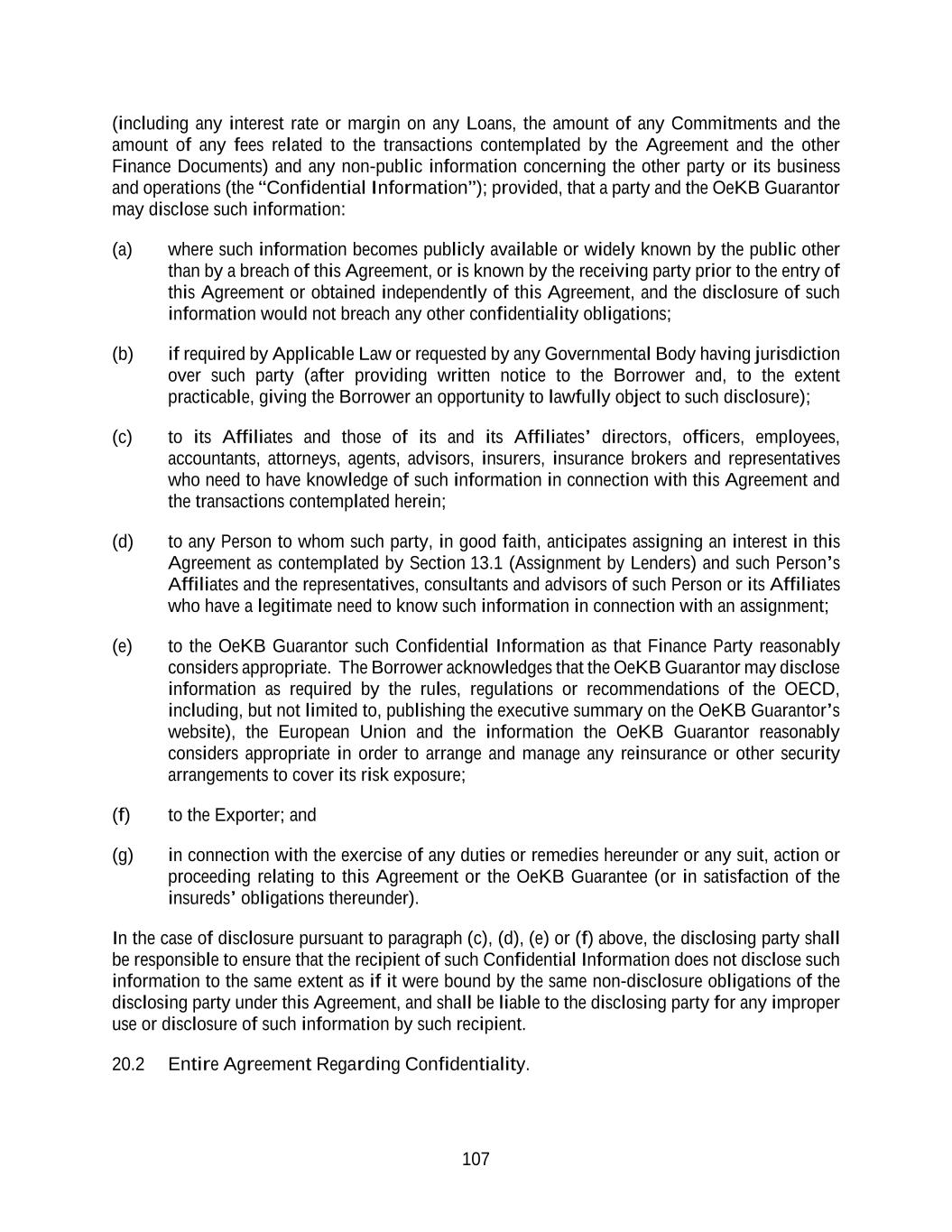 107 (including any interest rate or margin on any Loans, the amount of any Commitments and the amount of any fees related to the transactions contemplated by the Agreement and the other Finance Documents) and any non-public information concerning the other party or its business and operations (the “Confidential Information”); provided, that a party and the OeKB Guarantor may disclose such information: (a) where such information becomes publicly available or widely known by the public other than by a breach of this Agreement, or is known by the receiving party prior to the entry of this Agreement or obtained independently of this Agreement, and the disclosure of such information would not breach any other confidentiality obligations; (b) if required by Applicable Law or requested by any Governmental Body having jurisdiction over such party (after providing written notice to the Borrower and, to the extent practicable, giving the Borrower an opportunity to lawfully object to such disclosure); (c) to its Affiliates and those of its and its Affiliates’ directors, officers, employees, accountants, attorneys, agents, advisors, insurers, insurance brokers and representatives who need to have knowledge of such information in connection with this Agreement and the transactions contemplated herein; (d) to any Person to whom such party, in good faith, anticipates assigning an interest in this Agreement as contemplated by Section 13.1 (Assignment by Lenders) and such Person’s Affiliates and the representatives, consultants and advisors of such Person or its Affiliates who have a legitimate need to know such information in connection with an assignment; (e) to the OeKB Guarantor such Confidential Information as that Finance Party reasonably considers appropriate. The Borrower acknowledges that the OeKB Guarantor may disclose information as required by the rules, regulations or recommendations of the OECD, including, but not limited to, publishing the executive summary on the OeKB Guarantor’s website), the European Union and the information the OeKB Guarantor reasonably considers appropriate in order to arrange and manage any reinsurance or other security arrangements to cover its risk exposure; (f) to the Exporter; and (g) in connection with the exercise of any duties or remedies hereunder or any suit, action or proceeding relating to this Agreement or the OeKB Guarantee (or in satisfaction of the insureds’ obligations thereunder). In the case of disclosure pursuant to paragraph (c), (d), (e) or (f) above, the disclosing party shall be responsible to ensure that the recipient of such Confidential Information does not disclose such information to the same extent as if it were bound by the same non-disclosure obligations of the disclosing party under this Agreement, and shall be liable to the disclosing party for any improper use or disclosure of such information by such recipient. 20.2 Entire Agreement Regarding Confidentiality.