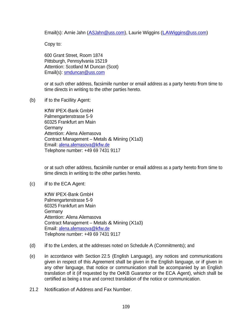 109 Email(s): Arnie Jahn (ASJahn@uss.com), Laurie Wiggins (LAWiggins@uss.com) Copy to: 600 Grant Street, Room 1874 Pittsburgh, Pennsylvania 15219 Attention: Scotland M Duncan (Scot) Email(s): smduncan@uss.com or at such other address, facsimile number or email address as a party hereto from time to time directs in writing to the other parties hereto. (b) if to the Facility Agent: KfW IPEX-Bank GmbH Palmengartenstrasse 5-9 60325 Frankfurt am Main Germany Attention: Alena Alemasova Contract Management – Metals & Mining (X1a3) Email: alena.alemasova@kfw.de Telephone number: +49 69 7431 9117 or at such other address, facsimile number or email address as a party hereto from time to time directs in writing to the other parties hereto. (c) if to the ECA Agent: KfW IPEX-Bank GmbH Palmengartenstrasse 5-9 60325 Frankfurt am Main Germany Attention: Alena Alemasova Contract Management – Metals & Mining (X1a3) Email: alena.alemasova@kfw.de Telephone number: +49 69 7431 9117 (d) if to the Lenders, at the addresses noted on Schedule A (Commitments); and (e) in accordance with Section 22.5 (English Language), any notices and communications given in respect of this Agreement shall be given in the English language, or if given in any other language, that notice or communication shall be accompanied by an English translation of it (if requested by the OeKB Guarantor or the ECA Agent), which shall be certified as being a true and correct translation of the notice or communication. 21.2 Notification of Address and Fax Number.
