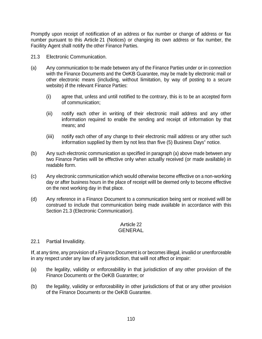 110 Promptly upon receipt of notification of an address or fax number or change of address or fax number pursuant to this Article 21 (Notices) or changing its own address or fax number, the Facility Agent shall notify the other Finance Parties. 21.3 Electronic Communication. (a) Any communication to be made between any of the Finance Parties under or in connection with the Finance Documents and the OeKB Guarantee, may be made by electronic mail or other electronic means (including, without limitation, by way of posting to a secure website) if the relevant Finance Parties: (i) agree that, unless and until notified to the contrary, this is to be an accepted form of communication; (ii) notify each other in writing of their electronic mail address and any other information required to enable the sending and receipt of information by that means; and (iii) notify each other of any change to their electronic mail address or any other such information supplied by them by not less than five (5) Business Days’ notice. (b) Any such electronic communication as specified in paragraph (a) above made between any two Finance Parties will be effective only when actually received (or made available) in readable form. (c) Any electronic communication which would otherwise become effective on a non-working day or after business hours in the place of receipt will be deemed only to become effective on the next working day in that place. (d) Any reference in a Finance Document to a communication being sent or received will be construed to include that communication being made available in accordance with this Section 21.3 (Electronic Communication). Article 22 GENERAL 22.1 Partial Invalidity. If, at any time, any provision of a Finance Document is or becomes illegal, invalid or unenforceable in any respect under any law of any jurisdiction, that will not affect or impair: (a) the legality, validity or enforceability in that jurisdiction of any other provision of the Finance Documents or the OeKB Guarantee; or (b) the legality, validity or enforceability in other jurisdictions of that or any other provision of the Finance Documents or the OeKB Guarantee.