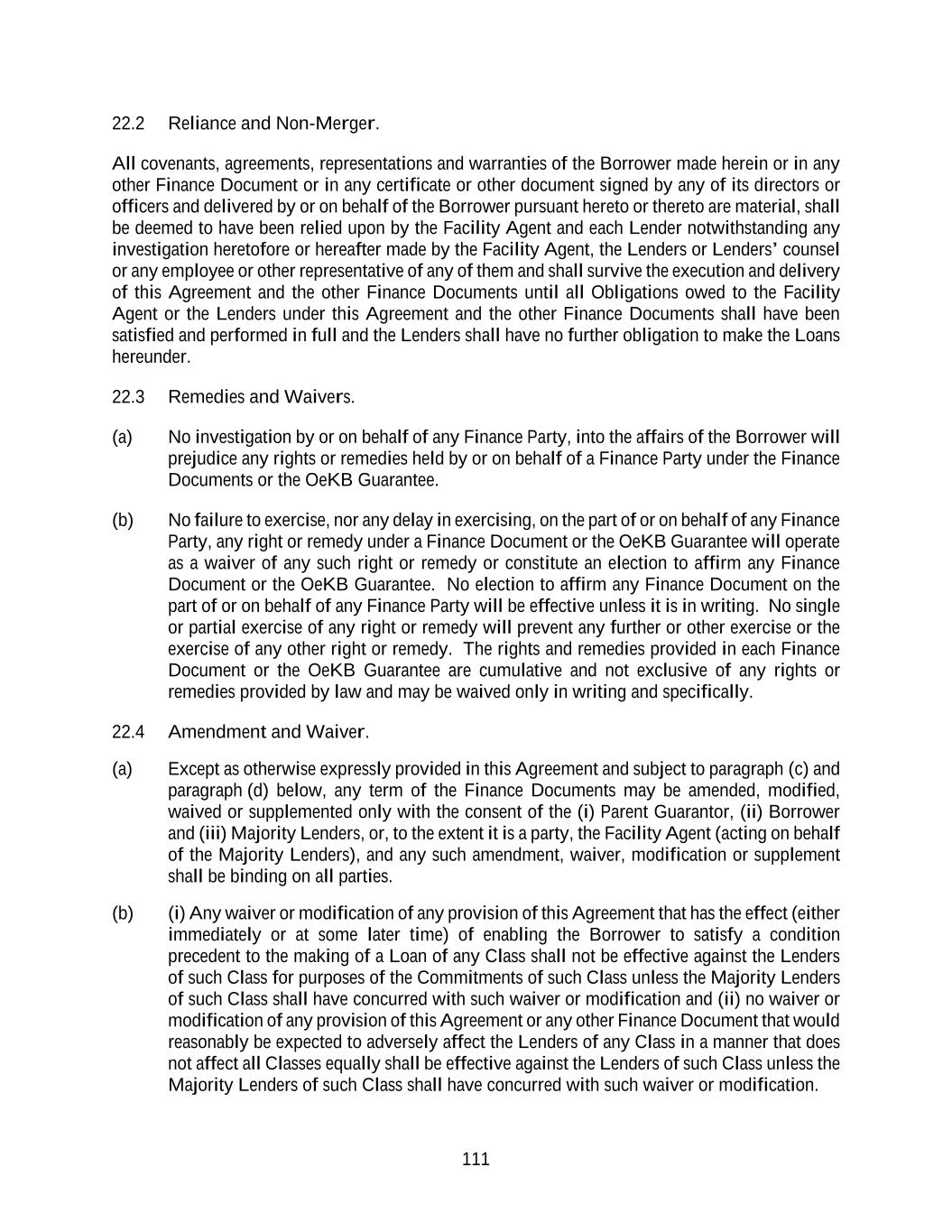 111 22.2 Reliance and Non-Merger. All covenants, agreements, representations and warranties of the Borrower made herein or in any other Finance Document or in any certificate or other document signed by any of its directors or officers and delivered by or on behalf of the Borrower pursuant hereto or thereto are material, shall be deemed to have been relied upon by the Facility Agent and each Lender notwithstanding any investigation heretofore or hereafter made by the Facility Agent, the Lenders or Lenders’ counsel or any employee or other representative of any of them and shall survive the execution and delivery of this Agreement and the other Finance Documents until all Obligations owed to the Facility Agent or the Lenders under this Agreement and the other Finance Documents shall have been satisfied and performed in full and the Lenders shall have no further obligation to make the Loans hereunder. 22.3 Remedies and Waivers. (a) No investigation by or on behalf of any Finance Party, into the affairs of the Borrower will prejudice any rights or remedies held by or on behalf of a Finance Party under the Finance Documents or the OeKB Guarantee. (b) No failure to exercise, nor any delay in exercising, on the part of or on behalf of any Finance Party, any right or remedy under a Finance Document or the OeKB Guarantee will operate as a waiver of any such right or remedy or constitute an election to affirm any Finance Document or the OeKB Guarantee. No election to affirm any Finance Document on the part of or on behalf of any Finance Party will be effective unless it is in writing. No single or partial exercise of any right or remedy will prevent any further or other exercise or the exercise of any other right or remedy. The rights and remedies provided in each Finance Document or the OeKB Guarantee are cumulative and not exclusive of any rights or remedies provided by law and may be waived only in writing and specifically. 22.4 Amendment and Waiver. (a) Except as otherwise expressly provided in this Agreement and subject to paragraph (c) and paragraph (d) below, any term of the Finance Documents may be amended, modified, waived or supplemented only with the consent of the (i) Parent Guarantor, (ii) Borrower and (iii) Majority Lenders, or, to the extent it is a party, the Facility Agent (acting on behalf of the Majority Lenders), and any such amendment, waiver, modification or supplement shall be binding on all parties. (b) (i) Any waiver or modification of any provision of this Agreement that has the effect (either immediately or at some later time) of enabling the Borrower to satisfy a condition precedent to the making of a Loan of any Class shall not be effective against the Lenders of such Class for purposes of the Commitments of such Class unless the Majority Lenders of such Class shall have concurred with such waiver or modification and (ii) no waiver or modification of any provision of this Agreement or any other Finance Document that would reasonably be expected to adversely affect the Lenders of any Class in a manner that does not affect all Classes equally shall be effective against the Lenders of such Class unless the Majority Lenders of such Class shall have concurred with such waiver or modification.