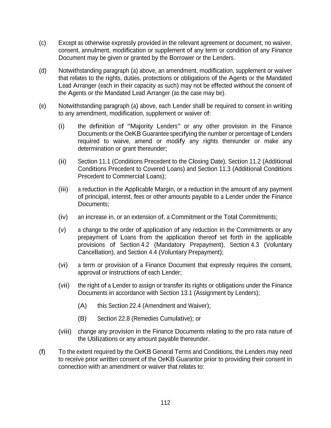 112 (c) Except as otherwise expressly provided in the relevant agreement or document, no waiver, consent, annulment, modification or supplement of any term or condition of any Finance Document may be given or granted by the Borrower or the Lenders. (d) Notwithstanding paragraph (a) above, an amendment, modification, supplement or waiver that relates to the rights, duties, protections or obligations of the Agents or the Mandated Lead Arranger (each in their capacity as such) may not be effected without the consent of the Agents or the Mandated Lead Arranger (as the case may be). (e) Notwithstanding paragraph (a) above, each Lender shall be required to consent in writing to any amendment, modification, supplement or waiver of: (i) the definition of “Majority Lenders” or any other provision in the Finance Documents or the OeKB Guarantee specifying the number or percentage of Lenders required to waive, amend or modify any rights thereunder or make any determination or grant thereunder; (ii) Section 11.1 (Conditions Precedent to the Closing Date), Section 11.2 (Additional Conditions Precedent to Covered Loans) and Section 11.3 (Additional Conditions Precedent to Commercial Loans); (iii) a reduction in the Applicable Margin, or a reduction in the amount of any payment of principal, interest, fees or other amounts payable to a Lender under the Finance Documents; (iv) an increase in, or an extension of, a Commitment or the Total Commitments; (v) a change to the order of application of any reduction in the Commitments or any prepayment of Loans from the application thereof set forth in the applicable provisions of Section 4.2 (Mandatory Prepayment), Section 4.3 (Voluntary Cancellation), and Section 4.4 (Voluntary Prepayment); (vi) a term or provision of a Finance Document that expressly requires the consent, approval or instructions of each Lender; (vii) the right of a Lender to assign or transfer its rights or obligations under the Finance Documents in accordance with Section 13.1 (Assignment by Lenders); (A) this Section 22.4 (Amendment and Waiver); (B) Section 22.8 (Remedies Cumulative); or (viii) change any provision in the Finance Documents relating to the pro rata nature of the Utilizations or any amount payable thereunder. (f) To the extent required by the OeKB General Terms and Conditions, the Lenders may need to receive prior written consent of the OeKB Guarantor prior to providing their consent in connection with an amendment or waiver that relates to: