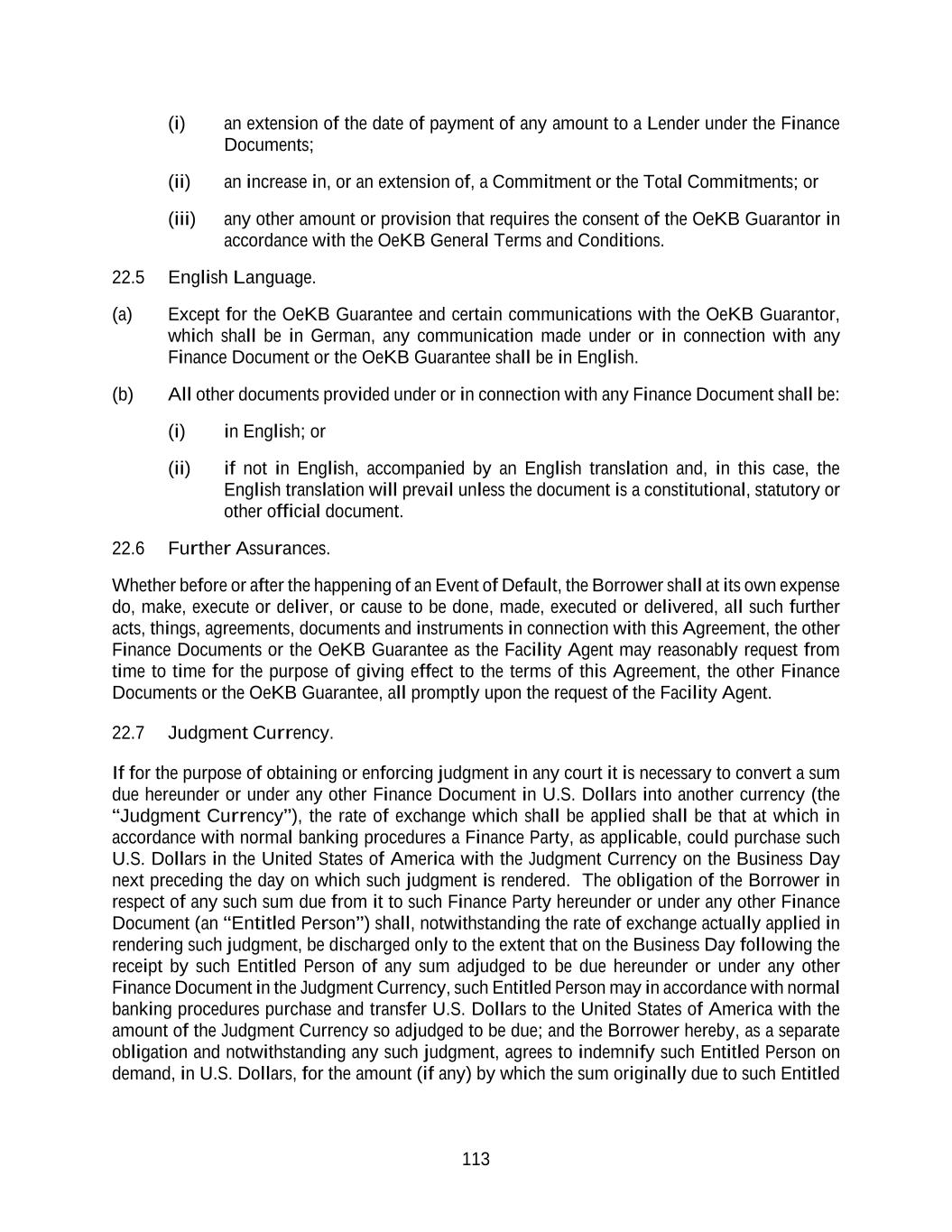 113 (i) an extension of the date of payment of any amount to a Lender under the Finance Documents; (ii) an increase in, or an extension of, a Commitment or the Total Commitments; or (iii) any other amount or provision that requires the consent of the OeKB Guarantor in accordance with the OeKB General Terms and Conditions. 22.5 English Language. (a) Except for the OeKB Guarantee and certain communications with the OeKB Guarantor, which shall be in German, any communication made under or in connection with any Finance Document or the OeKB Guarantee shall be in English. (b) All other documents provided under or in connection with any Finance Document shall be: (i) in English; or (ii) if not in English, accompanied by an English translation and, in this case, the English translation will prevail unless the document is a constitutional, statutory or other official document. 22.6 Further Assurances. Whether before or after the happening of an Event of Default, the Borrower shall at its own expense do, make, execute or deliver, or cause to be done, made, executed or delivered, all such further acts, things, agreements, documents and instruments in connection with this Agreement, the other Finance Documents or the OeKB Guarantee as the Facility Agent may reasonably request from time to time for the purpose of giving effect to the terms of this Agreement, the other Finance Documents or the OeKB Guarantee, all promptly upon the request of the Facility Agent. 22.7 Judgment Currency. If for the purpose of obtaining or enforcing judgment in any court it is necessary to convert a sum due hereunder or under any other Finance Document in U.S. Dollars into another currency (the “Judgment Currency”), the rate of exchange which shall be applied shall be that at which in accordance with normal banking procedures a Finance Party, as applicable, could purchase such U.S. Dollars in the United States of America with the Judgment Currency on the Business Day next preceding the day on which such judgment is rendered. The obligation of the Borrower in respect of any such sum due from it to such Finance Party hereunder or under any other Finance Document (an “Entitled Person”) shall, notwithstanding the rate of exchange actually applied in rendering such judgment, be discharged only to the extent that on the Business Day following the receipt by such Entitled Person of any sum adjudged to be due hereunder or under any other Finance Document in the Judgment Currency, such Entitled Person may in accordance with normal banking procedures purchase and transfer U.S. Dollars to the United States of America with the amount of the Judgment Currency so adjudged to be due; and the Borrower hereby, as a separate obligation and notwithstanding any such judgment, agrees to indemnify such Entitled Person on demand, in U.S. Dollars, for the amount (if any) by which the sum originally due to such Entitled