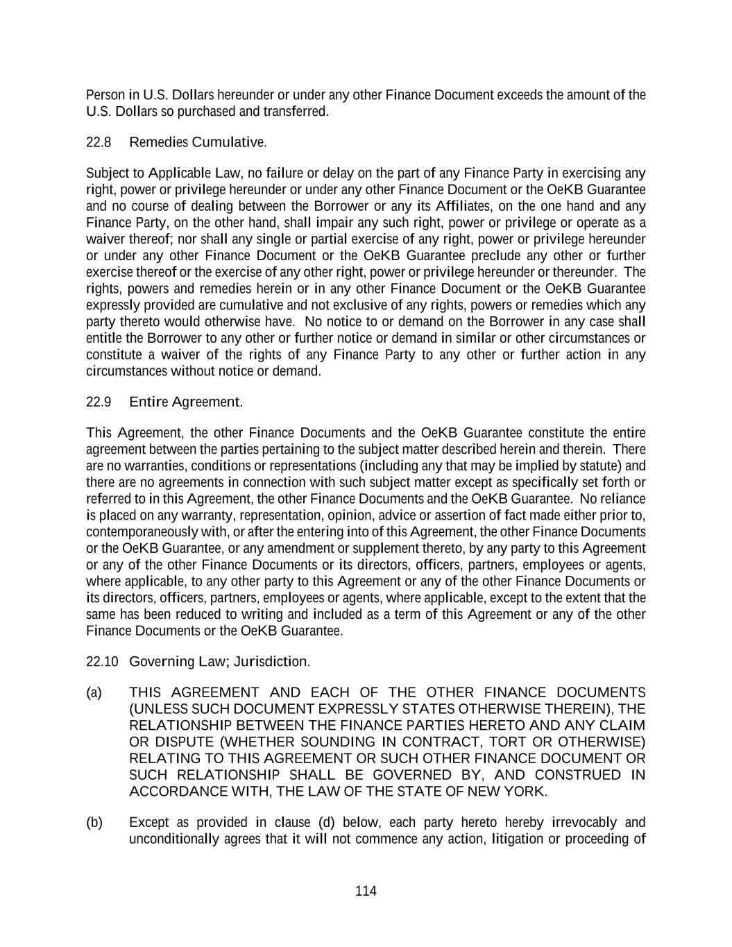 114 Person in U.S. Dollars hereunder or under any other Finance Document exceeds the amount of the U.S. Dollars so purchased and transferred. 22.8 Remedies Cumulative. Subject to Applicable Law, no failure or delay on the part of any Finance Party in exercising any right, power or privilege hereunder or under any other Finance Document or the OeKB Guarantee and no course of dealing between the Borrower or any its Affiliates, on the one hand and any Finance Party, on the other hand, shall impair any such right, power or privilege or operate as a waiver thereof; nor shall any single or partial exercise of any right, power or privilege hereunder or under any other Finance Document or the OeKB Guarantee preclude any other or further exercise thereof or the exercise of any other right, power or privilege hereunder or thereunder. The rights, powers and remedies herein or in any other Finance Document or the OeKB Guarantee expressly provided are cumulative and not exclusive of any rights, powers or remedies which any party thereto would otherwise have. No notice to or demand on the Borrower in any case shall entitle the Borrower to any other or further notice or demand in similar or other circumstances or constitute a waiver of the rights of any Finance Party to any other or further action in any circumstances without notice or demand. 22.9 Entire Agreement. This Agreement, the other Finance Documents and the OeKB Guarantee constitute the entire agreement between the parties pertaining to the subject matter described herein and therein. There are no warranties, conditions or representations (including any that may be implied by statute) and there are no agreements in connection with such subject matter except as specifically set forth or referred to in this Agreement, the other Finance Documents and the OeKB Guarantee. No reliance is placed on any warranty, representation, opinion, advice or assertion of fact made either prior to, contemporaneously with, or after the entering into of this Agreement, the other Finance Documents or the OeKB Guarantee, or any amendment or supplement thereto, by any party to this Agreement or any of the other Finance Documents or its directors, officers, partners, employees or agents, where applicable, to any other party to this Agreement or any of the other Finance Documents or its directors, officers, partners, employees or agents, where applicable, except to the extent that the same has been reduced to writing and included as a term of this Agreement or any of the other Finance Documents or the OeKB Guarantee. 22.10 Governing Law; Jurisdiction. (a) THIS AGREEMENT AND EACH OF THE OTHER FINANCE DOCUMENTS (UNLESS SUCH DOCUMENT EXPRESSLY STATES OTHERWISE THEREIN), THE RELATIONSHIP BETWEEN THE FINANCE PARTIES HERETO AND ANY CLAIM OR DISPUTE (WHETHER SOUNDING IN CONTRACT, TORT OR OTHERWISE) RELATING TO THIS AGREEMENT OR SUCH OTHER FINANCE DOCUMENT OR SUCH RELATIONSHIP SHALL BE GOVERNED BY, AND CONSTRUED IN ACCORDANCE WITH, THE LAW OF THE STATE OF NEW YORK. (b) Except as provided in clause (d) below, each party hereto hereby irrevocably and unconditionally agrees that it will not commence any action, litigation or proceeding of