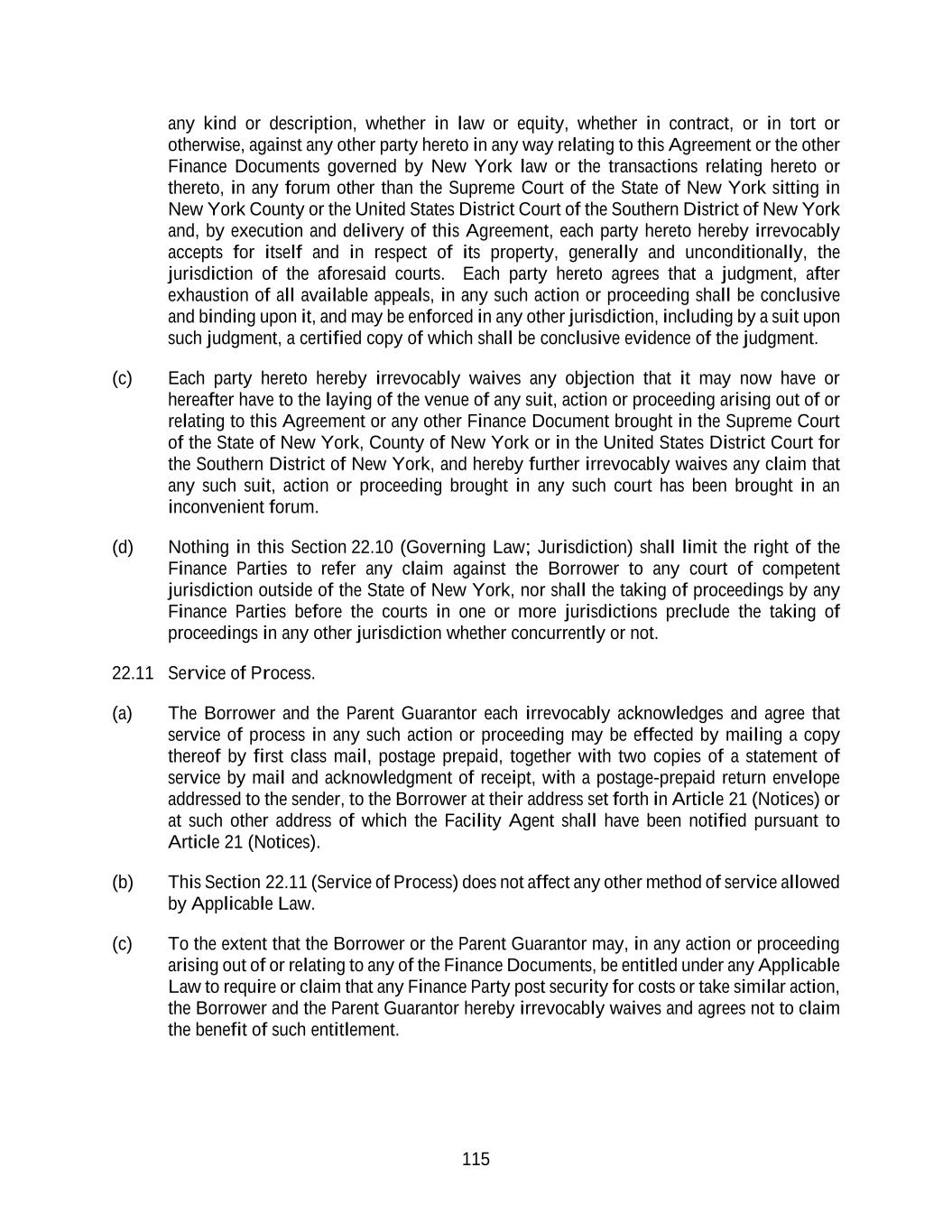 115 any kind or description, whether in law or equity, whether in contract, or in tort or otherwise, against any other party hereto in any way relating to this Agreement or the other Finance Documents governed by New York law or the transactions relating hereto or thereto, in any forum other than the Supreme Court of the State of New York sitting in New York County or the United States District Court of the Southern District of New York and, by execution and delivery of this Agreement, each party hereto hereby irrevocably accepts for itself and in respect of its property, generally and unconditionally, the jurisdiction of the aforesaid courts. Each party hereto agrees that a judgment, after exhaustion of all available appeals, in any such action or proceeding shall be conclusive and binding upon it, and may be enforced in any other jurisdiction, including by a suit upon such judgment, a certified copy of which shall be conclusive evidence of the judgment. (c) Each party hereto hereby irrevocably waives any objection that it may now have or hereafter have to the laying of the venue of any suit, action or proceeding arising out of or relating to this Agreement or any other Finance Document brought in the Supreme Court of the State of New York, County of New York or in the United States District Court for the Southern District of New York, and hereby further irrevocably waives any claim that any such suit, action or proceeding brought in any such court has been brought in an inconvenient forum. (d) Nothing in this Section 22.10 (Governing Law; Jurisdiction) shall limit the right of the Finance Parties to refer any claim against the Borrower to any court of competent jurisdiction outside of the State of New York, nor shall the taking of proceedings by any Finance Parties before the courts in one or more jurisdictions preclude the taking of proceedings in any other jurisdiction whether concurrently or not. 22.11 Service of Process. (a) The Borrower and the Parent Guarantor each irrevocably acknowledges and agree that service of process in any such action or proceeding may be effected by mailing a copy thereof by first class mail, postage prepaid, together with two copies of a statement of service by mail and acknowledgment of receipt, with a postage-prepaid return envelope addressed to the sender, to the Borrower at their address set forth in Article 21 (Notices) or at such other address of which the Facility Agent shall have been notified pursuant to Article 21 (Notices). (b) This Section 22.11 (Service of Process) does not affect any other method of service allowed by Applicable Law. (c) To the extent that the Borrower or the Parent Guarantor may, in any action or proceeding arising out of or relating to any of the Finance Documents, be entitled under any Applicable Law to require or claim that any Finance Party post security for costs or take similar action, the Borrower and the Parent Guarantor hereby irrevocably waives and agrees not to claim the benefit of such entitlement.