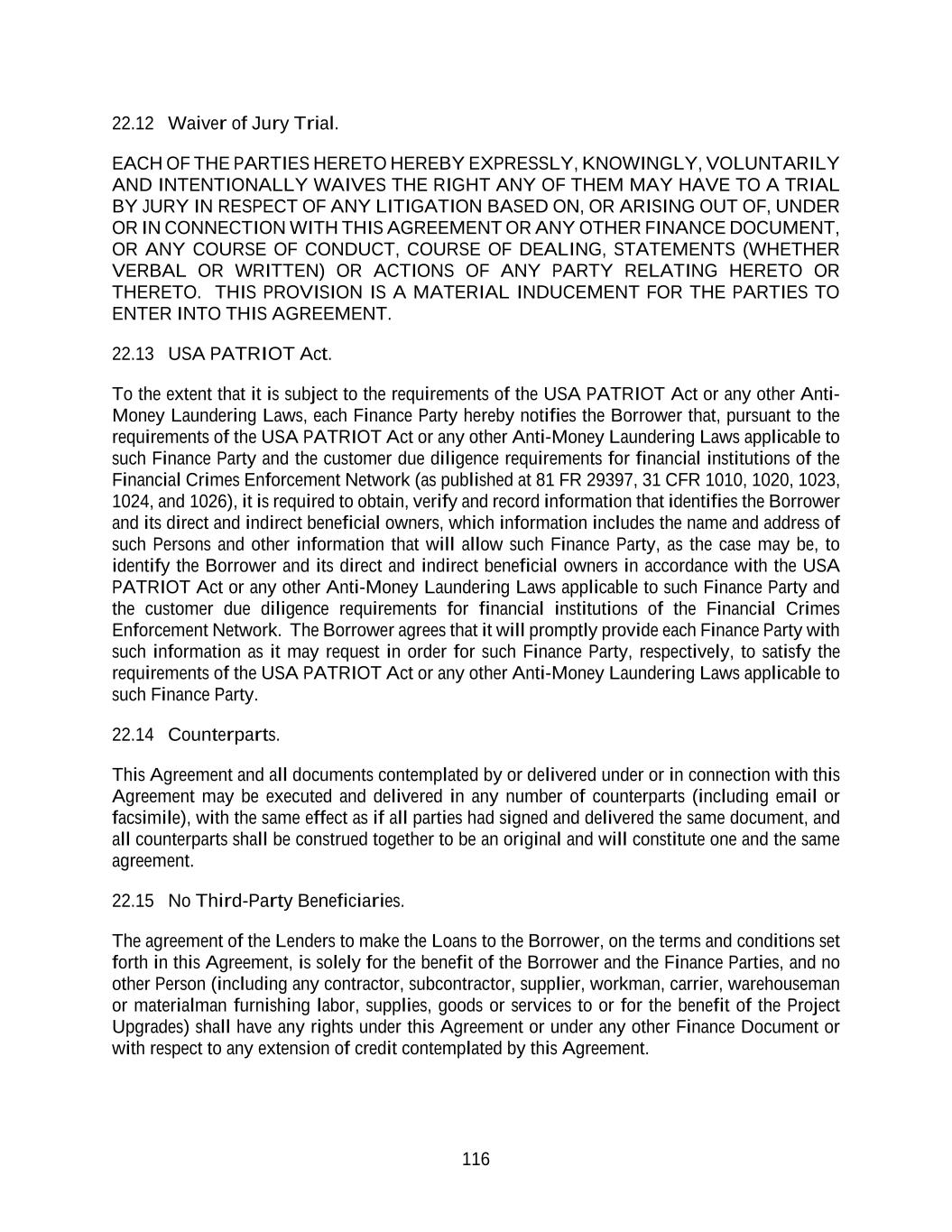 116 22.12 Waiver of Jury Trial. EACH OF THE PARTIES HERETO HEREBY EXPRESSLY, KNOWINGLY, VOLUNTARILY AND INTENTIONALLY WAIVES THE RIGHT ANY OF THEM MAY HAVE TO A TRIAL BY JURY IN RESPECT OF ANY LITIGATION BASED ON, OR ARISING OUT OF, UNDER OR IN CONNECTION WITH THIS AGREEMENT OR ANY OTHER FINANCE DOCUMENT, OR ANY COURSE OF CONDUCT, COURSE OF DEALING, STATEMENTS (WHETHER VERBAL OR WRITTEN) OR ACTIONS OF ANY PARTY RELATING HERETO OR THERETO. THIS PROVISION IS A MATERIAL INDUCEMENT FOR THE PARTIES TO ENTER INTO THIS AGREEMENT. 22.13 USA PATRIOT Act. To the extent that it is subject to the requirements of the USA PATRIOT Act or any other Anti- Money Laundering Laws, each Finance Party hereby notifies the Borrower that, pursuant to the requirements of the USA PATRIOT Act or any other Anti-Money Laundering Laws applicable to such Finance Party and the customer due diligence requirements for financial institutions of the Financial Crimes Enforcement Network (as published at 81 FR 29397, 31 CFR 1010, 1020, 1023, 1024, and 1026), it is required to obtain, verify and record information that identifies the Borrower and its direct and indirect beneficial owners, which information includes the name and address of such Persons and other information that will allow such Finance Party, as the case may be, to identify the Borrower and its direct and indirect beneficial owners in accordance with the USA PATRIOT Act or any other Anti-Money Laundering Laws applicable to such Finance Party and the customer due diligence requirements for financial institutions of the Financial Crimes Enforcement Network. The Borrower agrees that it will promptly provide each Finance Party with such information as it may request in order for such Finance Party, respectively, to satisfy the requirements of the USA PATRIOT Act or any other Anti-Money Laundering Laws applicable to such Finance Party. 22.14 Counterparts. This Agreement and all documents contemplated by or delivered under or in connection with this Agreement may be executed and delivered in any number of counterparts (including email or facsimile), with the same effect as if all parties had signed and delivered the same document, and all counterparts shall be construed together to be an original and will constitute one and the same agreement. 22.15 No Third-Party Beneficiaries. The agreement of the Lenders to make the Loans to the Borrower, on the terms and conditions set forth in this Agreement, is solely for the benefit of the Borrower and the Finance Parties, and no other Person (including any contractor, subcontractor, supplier, workman, carrier, warehouseman or materialman furnishing labor, supplies, goods or services to or for the benefit of the Project Upgrades) shall have any rights under this Agreement or under any other Finance Document or with respect to any extension of credit contemplated by this Agreement.