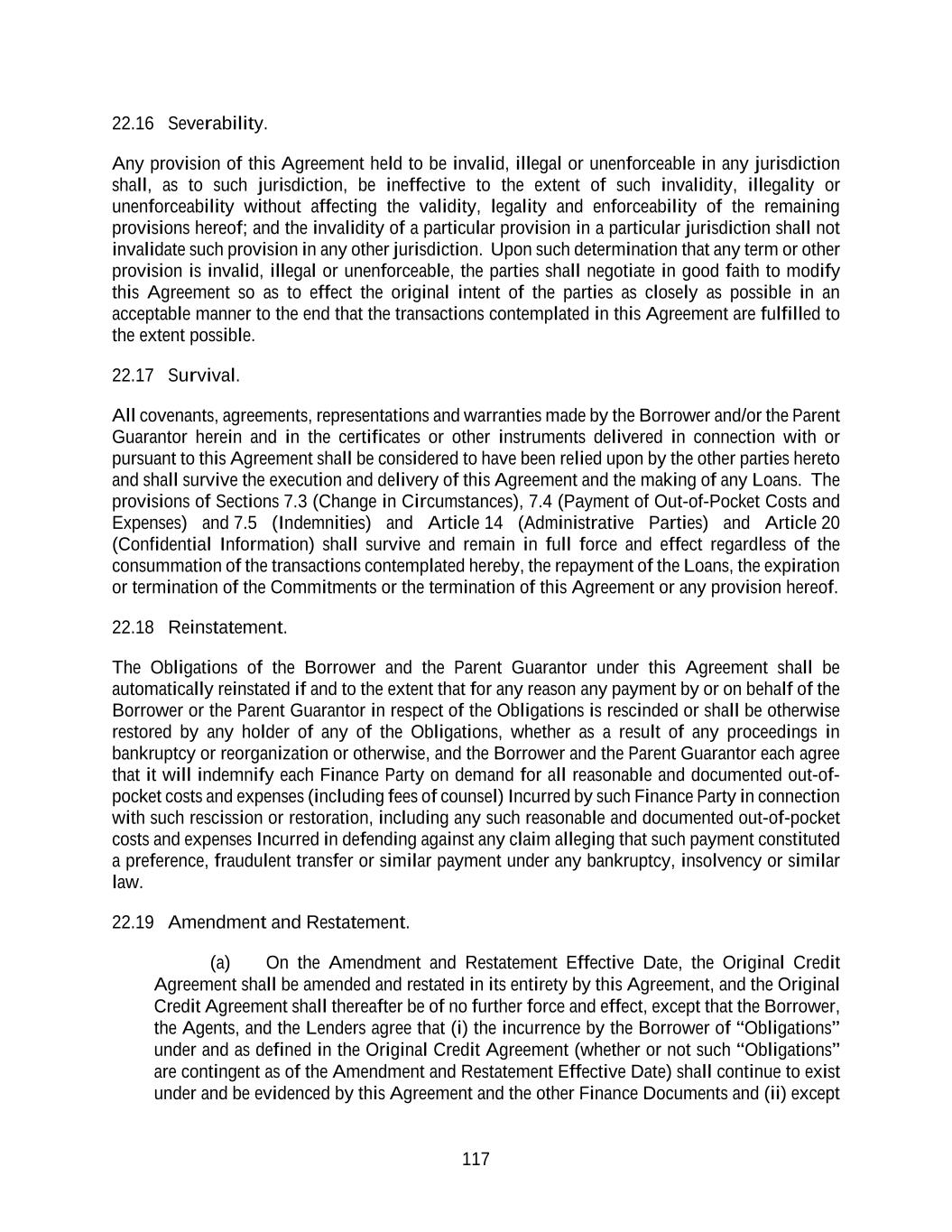 117 22.16 Severability. Any provision of this Agreement held to be invalid, illegal or unenforceable in any jurisdiction shall, as to such jurisdiction, be ineffective to the extent of such invalidity, illegality or unenforceability without affecting the validity, legality and enforceability of the remaining provisions hereof; and the invalidity of a particular provision in a particular jurisdiction shall not invalidate such provision in any other jurisdiction. Upon such determination that any term or other provision is invalid, illegal or unenforceable, the parties shall negotiate in good faith to modify this Agreement so as to effect the original intent of the parties as closely as possible in an acceptable manner to the end that the transactions contemplated in this Agreement are fulfilled to the extent possible. 22.17 Survival. All covenants, agreements, representations and warranties made by the Borrower and/or the Parent Guarantor herein and in the certificates or other instruments delivered in connection with or pursuant to this Agreement shall be considered to have been relied upon by the other parties hereto and shall survive the execution and delivery of this Agreement and the making of any Loans. The provisions of Sections 7.3 (Change in Circumstances), 7.4 (Payment of Out-of-Pocket Costs and Expenses) and 7.5 (Indemnities) and Article 14 (Administrative Parties) and Article 20 (Confidential Information) shall survive and remain in full force and effect regardless of the consummation of the transactions contemplated hereby, the repayment of the Loans, the expiration or termination of the Commitments or the termination of this Agreement or any provision hereof. 22.18 Reinstatement. The Obligations of the Borrower and the Parent Guarantor under this Agreement shall be automatically reinstated if and to the extent that for any reason any payment by or on behalf of the Borrower or the Parent Guarantor in respect of the Obligations is rescinded or shall be otherwise restored by any holder of any of the Obligations, whether as a result of any proceedings in bankruptcy or reorganization or otherwise, and the Borrower and the Parent Guarantor each agree that it will indemnify each Finance Party on demand for all reasonable and documented out-of- pocket costs and expenses (including fees of counsel) Incurred by such Finance Party in connection with such rescission or restoration, including any such reasonable and documented out-of-pocket costs and expenses Incurred in defending against any claim alleging that such payment constituted a preference, fraudulent transfer or similar payment under any bankruptcy, insolvency or similar law. 22.19 Amendment and Restatement. (a) On the Amendment and Restatement Effective Date, the Original Credit Agreement shall be amended and restated in its entirety by this Agreement, and the Original Credit Agreement shall thereafter be of no further force and effect, except that the Borrower, the Agents, and the Lenders agree that (i) the incurrence by the Borrower of “Obligations” under and as defined in the Original Credit Agreement (whether or not such “Obligations” are contingent as of the Amendment and Restatement Effective Date) shall continue to exist under and be evidenced by this Agreement and the other Finance Documents and (ii) except