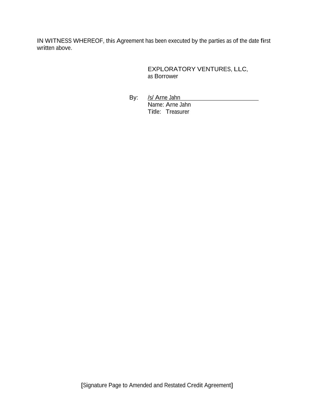 [Signature Page to Amended and Restated Credit Agreement] IN WITNESS WHEREOF, this Agreement has been executed by the parties as of the date first written above. EXPLORATORY VENTURES, LLC, as Borrower By: /s/ Arne Jahn Name: Arne Jahn Title: Treasurer