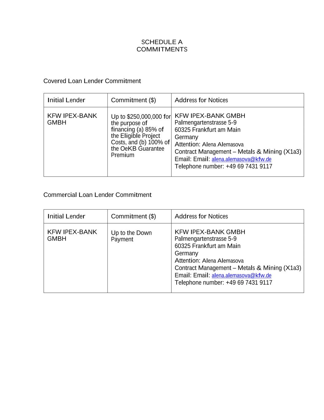 SCHEDULE A COMMITMENTS Covered Loan Lender Commitment Initial Lender Commitment ($) Address for Notices KFW IPEX-BANK Up to $250,000,000 for the purpose of financing (a) 85% of the Eligible Project Costs, and (b) 100% of the OeKB Guarantee Premium KFW IPEX-BANK GMBH GMBH Palmengartenstrasse 5-9 60325 Frankfurt am Main Germany Attention: Alena Alemasova Contract Management – Metals & Mining (X1a3) Email: Email: alena.alemasova@kfw.de Telephone number: +49 69 7431 9117 Commercial Loan Lender Commitment Initial Lender Commitment ($) Address for Notices KFW IPEX-BANK Up to the Down Payment KFW IPEX-BANK GMBH GMBH Palmengartenstrasse 5-9 60325 Frankfurt am Main Germany Attention: Alena Alemasova Contract Management – Metals & Mining (X1a3) Email: Email: alena.alemasova@kfw.de Telephone number: +49 69 7431 9117