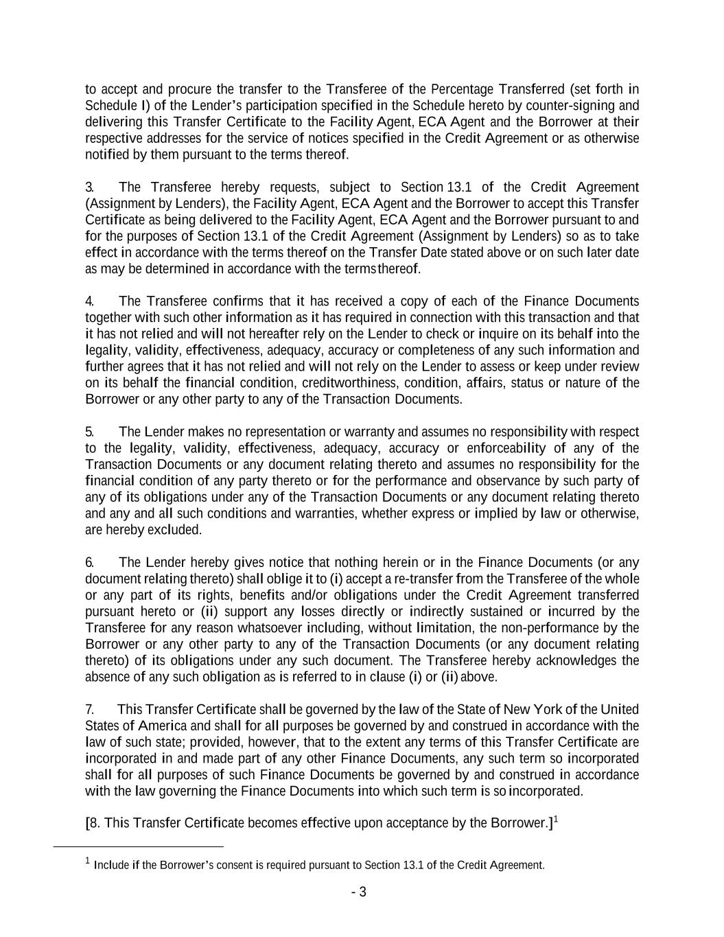 - 3 to accept and procure the transfer to the Transferee of the Percentage Transferred (set forth in Schedule I) of the Lender’s participation specified in the Schedule hereto by counter-signing and delivering this Transfer Certificate to the Facility Agent, ECA Agent and the Borrower at their respective addresses for the service of notices specified in the Credit Agreement or as otherwise notified by them pursuant to the terms thereof. 3. The Transferee hereby requests, subject to Section 13.1 of the Credit Agreement (Assignment by Lenders), the Facility Agent, ECA Agent and the Borrower to accept this Transfer Certificate as being delivered to the Facility Agent, ECA Agent and the Borrower pursuant to and for the purposes of Section 13.1 of the Credit Agreement (Assignment by Lenders) so as to take effect in accordance with the terms thereof on the Transfer Date stated above or on such later date as may be determined in accordance with the terms thereof. 4. The Transferee confirms that it has received a copy of each of the Finance Documents together with such other information as it has required in connection with this transaction and that it has not relied and will not hereafter rely on the Lender to check or inquire on its behalf into the legality, validity, effectiveness, adequacy, accuracy or completeness of any such information and further agrees that it has not relied and will not rely on the Lender to assess or keep under review on its behalf the financial condition, creditworthiness, condition, affairs, status or nature of the Borrower or any other party to any of the Transaction Documents. 5. The Lender makes no representation or warranty and assumes no responsibility with respect to the legality, validity, effectiveness, adequacy, accuracy or enforceability of any of the Transaction Documents or any document relating thereto and assumes no responsibility for the financial condition of any party thereto or for the performance and observance by such party of any of its obligations under any of the Transaction Documents or any document relating thereto and any and all such conditions and warranties, whether express or implied by law or otherwise, are hereby excluded. 6. The Lender hereby gives notice that nothing herein or in the Finance Documents (or any document relating thereto) shall oblige it to (i) accept a re-transfer from the Transferee of the whole or any part of its rights, benefits and/or obligations under the Credit Agreement transferred pursuant hereto or (ii) support any losses directly or indirectly sustained or incurred by the Transferee for any reason whatsoever including, without limitation, the non-performance by the Borrower or any other party to any of the Transaction Documents (or any document relating thereto) of its obligations under any such document. The Transferee hereby acknowledges the absence of any such obligation as is referred to in clause (i) or (ii) above. 7. This Transfer Certificate shall be governed by the law of the State of New York of the United States of America and shall for all purposes be governed by and construed in accordance with the law of such state; provided, however, that to the extent any terms of this Transfer Certificate are incorporated in and made part of any other Finance Documents, any such term so incorporated shall for all purposes of such Finance Documents be governed by and construed in accordance with the law governing the Finance Documents into which such term is so incorporated. [8. This Transfer Certificate becomes effective upon acceptance by the Borrower.]1 1 Include if the Borrower’s consent is required pursuant to Section 13.1 of the Credit Agreement.