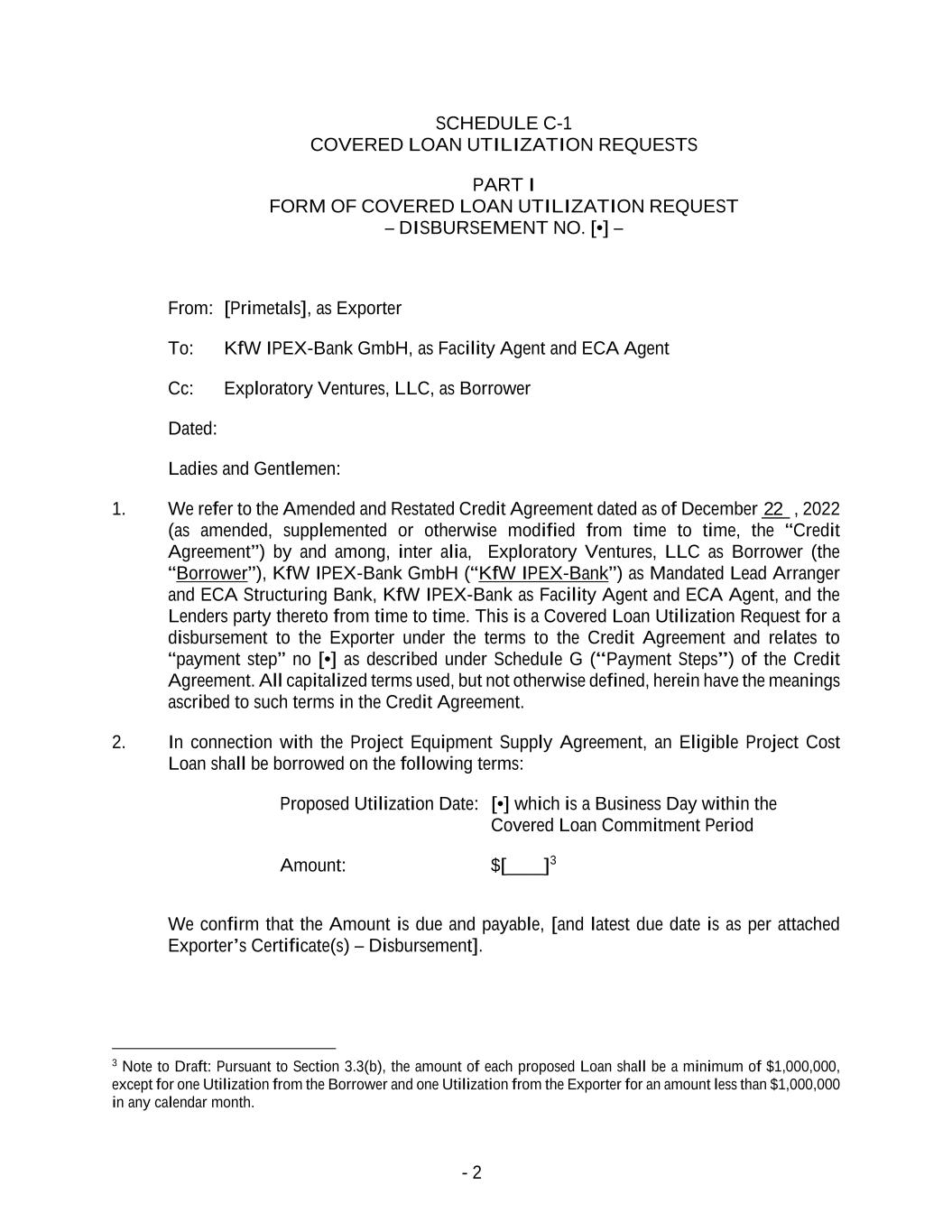 - 2 SCHEDULE C-1 COVERED LOAN UTILIZATION REQUESTS PART I FORM OF COVERED LOAN UTILIZATION REQUEST – DISBURSEMENT NO. [•] – From: [Primetals], as Exporter To: KfW IPEX-Bank GmbH, as Facility Agent and ECA Agent Cc: Exploratory Ventures, LLC, as Borrower Dated: Ladies and Gentlemen: 1. We refer to the Amended and Restated Credit Agreement dated as of December ___ , 2022 (as amended, supplemented or otherwise modified from time to time, the “Credit Agreement”) by and among, inter alia, Exploratory Ventures, LLC as Borrower (the “Borrower”), KfW IPEX-Bank GmbH (“KfW IPEX-Bank”) as Mandated Lead Arranger and ECA Structuring Bank, KfW IPEX-Bank as Facility Agent and ECA Agent, and the Lenders party thereto from time to time. This is a Covered Loan Utilization Request for a disbursement to the Exporter under the terms to the Credit Agreement and relates to “payment step” no [•] as described under Schedule G (“Payment Steps”) of the Credit Agreement. All capitalized terms used, but not otherwise defined, herein have the meanings ascribed to such terms in the Credit Agreement. 2. In connection with the Project Equipment Supply Agreement, an Eligible Project Cost Loan shall be borrowed on the following terms: Proposed Utilization Date: [•] which is a Business Day within the Covered Loan Commitment Period Amount: $[____]3 We confirm that the Amount is due and payable, [and latest due date is as per attached Exporter’s Certificate(s) – Disbursement]. 3 Note to Draft: Pursuant to Section 3.3(b), the amount of each proposed Loan shall be a minimum of $1,000,000, except for one Utilization from the Borrower and one Utilization from the Exporter for an amount less than $1,000,000 in any calendar month. 22