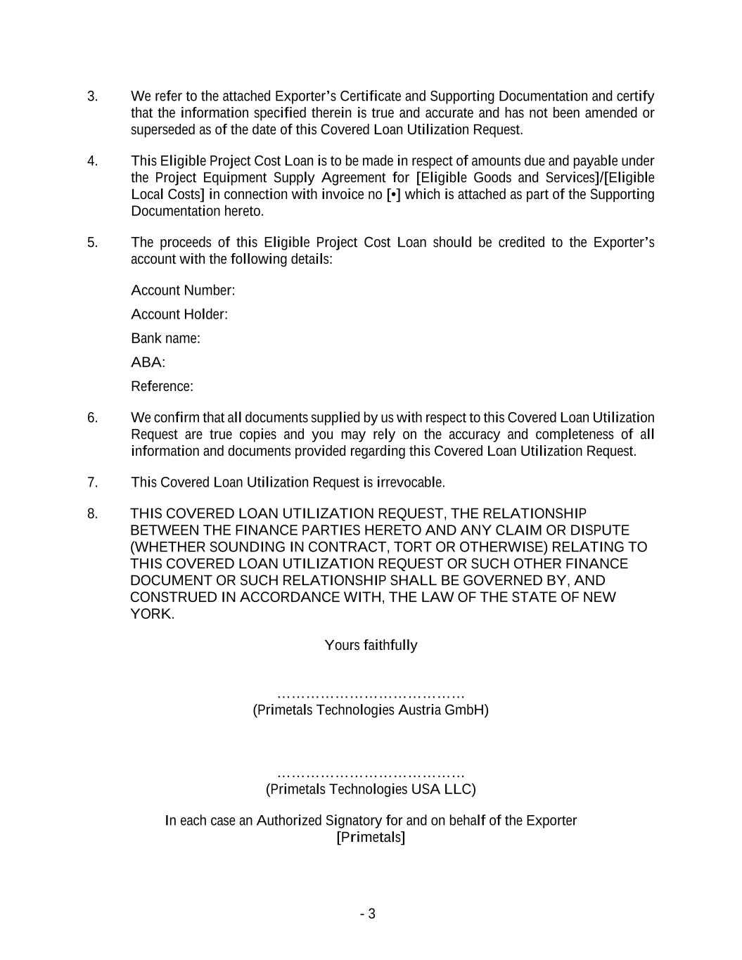 - 3 3. We refer to the attached Exporter’s Certificate and Supporting Documentation and certify that the information specified therein is true and accurate and has not been amended or superseded as of the date of this Covered Loan Utilization Request. 4. This Eligible Project Cost Loan is to be made in respect of amounts due and payable under the Project Equipment Supply Agreement for [Eligible Goods and Services]/[Eligible Local Costs] in connection with invoice no [•] which is attached as part of the Supporting Documentation hereto. 5. The proceeds of this Eligible Project Cost Loan should be credited to the Exporter’s account with the following details: Account Number: Account Holder: Bank name: ABA: Reference: 6. We confirm that all documents supplied by us with respect to this Covered Loan Utilization Request are true copies and you may rely on the accuracy and completeness of all information and documents provided regarding this Covered Loan Utilization Request. 7. This Covered Loan Utilization Request is irrevocable. 8. THIS COVERED LOAN UTILIZATION REQUEST, THE RELATIONSHIP BETWEEN THE FINANCE PARTIES HERETO AND ANY CLAIM OR DISPUTE (WHETHER SOUNDING IN CONTRACT, TORT OR OTHERWISE) RELATING TO THIS COVERED LOAN UTILIZATION REQUEST OR SUCH OTHER FINANCE DOCUMENT OR SUCH RELATIONSHIP SHALL BE GOVERNED BY, AND CONSTRUED IN ACCORDANCE WITH, THE LAW OF THE STATE OF NEW YORK. Yours faithfully ………………………………… (Primetals Technologies Austria GmbH) ………………………………… (Primetals Technologies USA LLC) In each case an Authorized Signatory for and on behalf of the Exporter [Primetals]