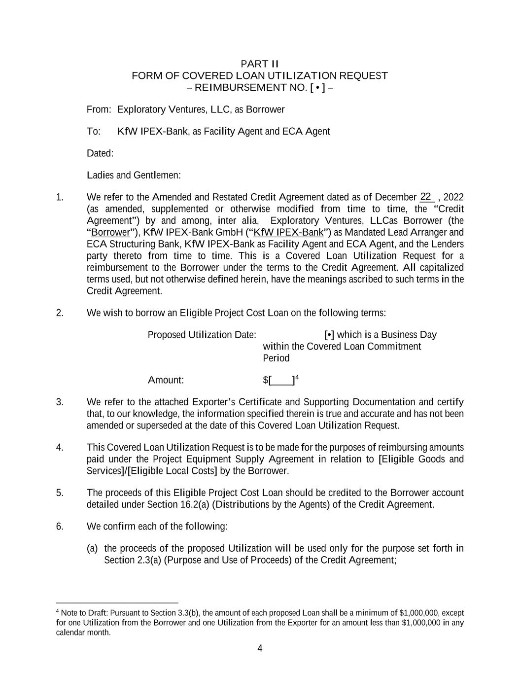 4 PART II FORM OF COVERED LOAN UTILIZATION REQUEST – REIMBURSEMENT NO. [ • ] – From: Exploratory Ventures, LLC, as Borrower To: KfW IPEX-Bank, as Facility Agent and ECA Agent Dated: Ladies and Gentlemen: 1. We refer to the Amended and Restated Credit Agreement dated as of December ___ , 2022 (as amended, supplemented or otherwise modified from time to time, the “Credit Agreement”) by and among, inter alia, Exploratory Ventures, LLCas Borrower (the “Borrower”), KfW IPEX-Bank GmbH (“KfW IPEX-Bank”) as Mandated Lead Arranger and ECA Structuring Bank, KfW IPEX-Bank as Facility Agent and ECA Agent, and the Lenders party thereto from time to time. This is a Covered Loan Utilization Request for a reimbursement to the Borrower under the terms to the Credit Agreement. All capitalized terms used, but not otherwise defined herein, have the meanings ascribed to such terms in the Credit Agreement. 2. We wish to borrow an Eligible Project Cost Loan on the following terms: Proposed Utilization Date: [•] which is a Business Day within the Covered Loan Commitment Period Amount: $[____]4 3. We refer to the attached Exporter’s Certificate and Supporting Documentation and certify that, to our knowledge, the information specified therein is true and accurate and has not been amended or superseded at the date of this Covered Loan Utilization Request. 4. This Covered Loan Utilization Request is to be made for the purposes of reimbursing amounts paid under the Project Equipment Supply Agreement in relation to [Eligible Goods and Services]/[Eligible Local Costs] by the Borrower. 5. The proceeds of this Eligible Project Cost Loan should be credited to the Borrower account detailed under Section 16.2(a) (Distributions by the Agents) of the Credit Agreement. 6. We confirm each of the following: (a) the proceeds of the proposed Utilization will be used only for the purpose set forth in Section 2.3(a) (Purpose and Use of Proceeds) of the Credit Agreement; 4 Note to Draft: Pursuant to Section 3.3(b), the amount of each proposed Loan shall be a minimum of $1,000,000, except for one Utilization from the Borrower and one Utilization from the Exporter for an amount less than $1,000,000 in any calendar month. 22