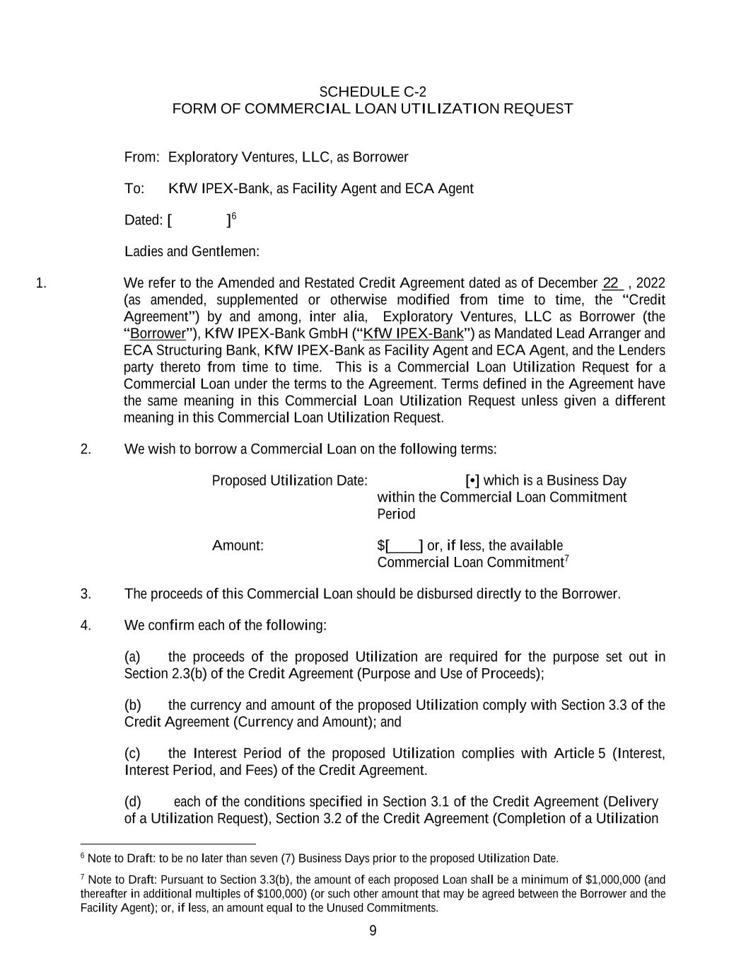 9 SCHEDULE C-2 FORM OF COMMERCIAL LOAN UTILIZATION REQUEST From: Exploratory Ventures, LLC, as Borrower To: KfW IPEX-Bank, as Facility Agent and ECA Agent Dated: [ ]6 Ladies and Gentlemen: 1. We refer to the Amended and Restated Credit Agreement dated as of December ___ , 2022 (as amended, supplemented or otherwise modified from time to time, the “Credit Agreement”) by and among, inter alia, Exploratory Ventures, LLC as Borrower (the “Borrower”), KfW IPEX-Bank GmbH (“KfW IPEX-Bank”) as Mandated Lead Arranger and ECA Structuring Bank, KfW IPEX-Bank as Facility Agent and ECA Agent, and the Lenders party thereto from time to time. This is a Commercial Loan Utilization Request for a Commercial Loan under the terms to the Agreement. Terms defined in the Agreement have the same meaning in this Commercial Loan Utilization Request unless given a different meaning in this Commercial Loan Utilization Request. 2. We wish to borrow a Commercial Loan on the following terms: Proposed Utilization Date: [•] which is a Business Day within the Commercial Loan Commitment Period Amount: $[____] or, if less, the available Commercial Loan Commitment7 3. The proceeds of this Commercial Loan should be disbursed directly to the Borrower. 4. We confirm each of the following: (a) the proceeds of the proposed Utilization are required for the purpose set out in Section 2.3(b) of the Credit Agreement (Purpose and Use of Proceeds); (b) the currency and amount of the proposed Utilization comply with Section 3.3 of the Credit Agreement (Currency and Amount); and (c) the Interest Period of the proposed Utilization complies with Article 5 (Interest, Interest Period, and Fees) of the Credit Agreement. (d) each of the conditions specified in Section 3.1 of the Credit Agreement (Delivery of a Utilization Request), Section 3.2 of the Credit Agreement (Completion of a Utilization 6 Note to Draft: to be no later than seven (7) Business Days prior to the proposed Utilization Date. 7 Note to Draft: Pursuant to Section 3.3(b), the amount of each proposed Loan shall be a minimum of $1,000,000 (and thereafter in additional multiples of $100,000) (or such other amount that may be agreed between the Borrower and the Facility Agent); or, if less, an amount equal to the Unused Commitments. 22