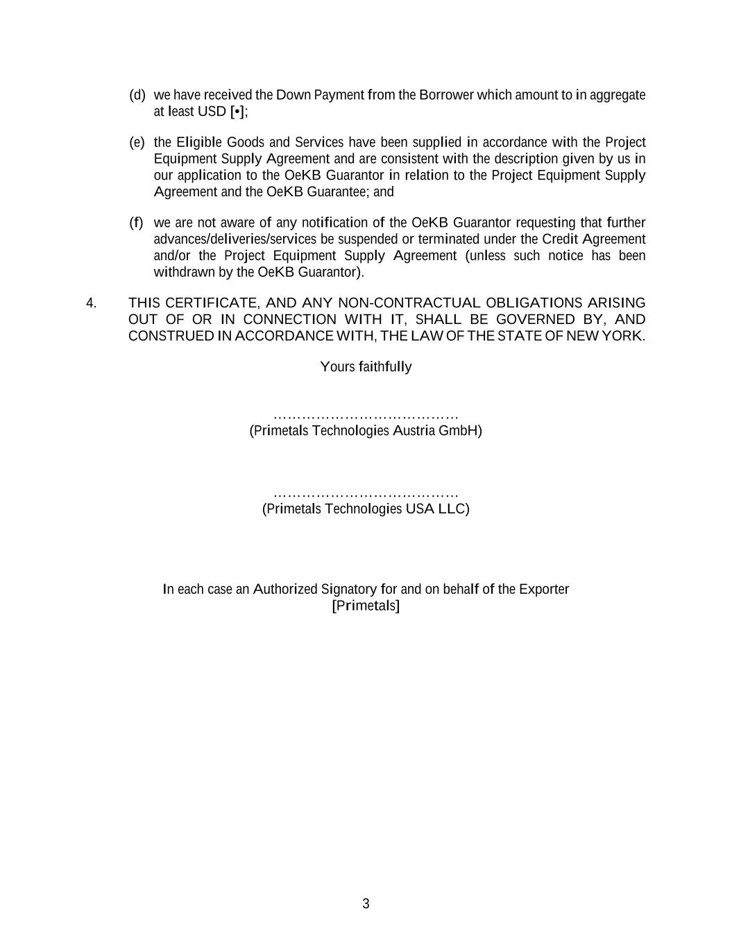 3 (d) we have received the Down Payment from the Borrower which amount to in aggregate at least USD [•]; (e) the Eligible Goods and Services have been supplied in accordance with the Project Equipment Supply Agreement and are consistent with the description given by us in our application to the OeKB Guarantor in relation to the Project Equipment Supply Agreement and the OeKB Guarantee; and (f) we are not aware of any notification of the OeKB Guarantor requesting that further advances/deliveries/services be suspended or terminated under the Credit Agreement and/or the Project Equipment Supply Agreement (unless such notice has been withdrawn by the OeKB Guarantor). 4. THIS CERTIFICATE, AND ANY NON-CONTRACTUAL OBLIGATIONS ARISING OUT OF OR IN CONNECTION WITH IT, SHALL BE GOVERNED BY, AND CONSTRUED IN ACCORDANCE WITH, THE LAW OF THE STATE OF NEW YORK. Yours faithfully ………………………………… (Primetals Technologies Austria GmbH) ………………………………… (Primetals Technologies USA LLC) In each case an Authorized Signatory for and on behalf of the Exporter [Primetals]