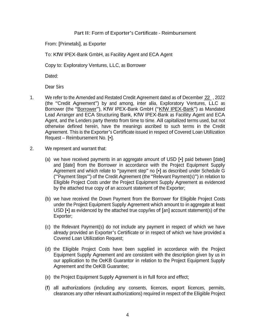 4 Part II: Form of Exporter’s Certificate - Reimbursement From: [Primetals], as Exporter To: KfW IPEX-Bank GmbH, as Facility Agent and ECA Agent Copy to: Exploratory Ventures, LLC, as Borrower Dated: Dear Sirs 1. We refer to the Amended and Restated Credit Agreement dated as of December ___ , 2022 (the “Credit Agreement”) by and among, inter alia, Exploratory Ventures, LLC as Borrower (the “Borrower”), KfW IPEX-Bank GmbH (“KfW IPEX-Bank”) as Mandated Lead Arranger and ECA Structuring Bank, KfW IPEX-Bank as Facility Agent and ECA Agent, and the Lenders party thereto from time to time. All capitalized terms used, but not otherwise defined herein, have the meanings ascribed to such terms in the Credit Agreement. This is the Exporter’s Certificate issued in respect of Covered Loan Utilization Request – Reimbursement No. [•]. 2. We represent and warrant that: (a) we have received payments in an aggregate amount of USD [•] paid between [date] and [date] from the Borrower in accordance with the Project Equipment Supply Agreement and which relate to “payment step” no [•] as described under Schedule G (“Payment Steps”) of the Credit Agreement (the “Relevant Payment(s)”) in relation to Eligible Project Costs under the Project Equipment Supply Agreement as evidenced by the attached true copy of an account statement of the Exporter; (b) we have received the Down Payment from the Borrower for Eligible Project Costs under the Project Equipment Supply Agreement which amount to in aggregate at least USD [•] as evidenced by the attached true copy/ies of [an] account statement(s) of the Exporter; (c) the Relevant Payment(s) do not include any payment in respect of which we have already provided an Exporter’s Certificate or in respect of which we have provided a Covered Loan Utilization Request; (d) the Eligible Project Costs have been supplied in accordance with the Project Equipment Supply Agreement and are consistent with the description given by us in our application to the OeKB Guarantor in relation to the Project Equipment Supply Agreement and the OeKB Guarantee; (e) the Project Equipment Supply Agreement is in full force and effect; (f) all authorizations (including any consents, licences, export licences, permits, clearances any other relevant authorizations) required in respect of the Eligible Project 22
