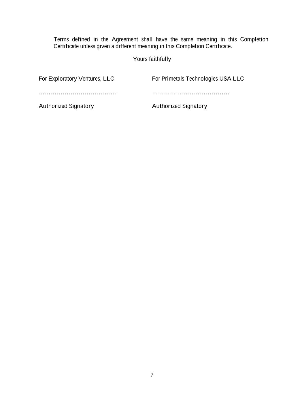 7 Terms defined in the Agreement shall have the same meaning in this Completion Certificate unless given a different meaning in this Completion Certificate. Yours faithfully For Exploratory Ventures, LLC For Primetals Technologies USA LLC ………………………………… Authorized Signatory ………………………………… Authorized Signatory