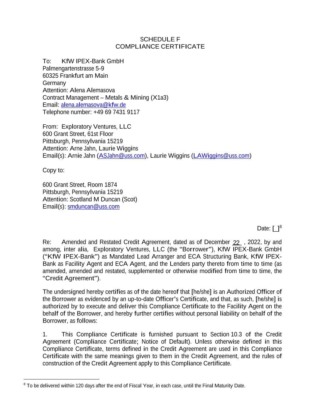SCHEDULE F COMPLIANCE CERTIFICATE To: KfW IPEX-Bank GmbH Palmengartenstrasse 5-9 60325 Frankfurt am Main Germany Attention: Alena Alemasova Contract Management – Metals & Mining (X1a3) Email: alena.alemasova@kfw.de Telephone number: +49 69 7431 9117 From: Exploratory Ventures, LLC 600 Grant Street, 61st Floor Pittsburgh, Pennsylvania 15219 Attention: Arne Jahn, Laurie Wiggins Email(s): Arnie Jahn (ASJahn@uss.com), Laurie Wiggins (LAWiggins@uss.com) Copy to: 600 Grant Street, Room 1874 Pittsburgh, Pennsylvania 15219 Attention: Scotland M Duncan (Scot) Email(s): smduncan@uss.com Date: [_]8 Re: Amended and Restated Credit Agreement, dated as of December ___ , 2022, by and among, inter alia, Exploratory Ventures, LLC (the “Borrower”), KfW IPEX-Bank GmbH (“KfW IPEX-Bank”) as Mandated Lead Arranger and ECA Structuring Bank, KfW IPEX- Bank as Facility Agent and ECA Agent, and the Lenders party thereto from time to time (as amended, amended and restated, supplemented or otherwise modified from time to time, the “Credit Agreement”). The undersigned hereby certifies as of the date hereof that [he/she] is an Authorized Officer of the Borrower as evidenced by an up-to-date Officer’s Certificate, and that, as such, [he/she] is authorized by to execute and deliver this Compliance Certificate to the Facility Agent on the behalf of the Borrower, and hereby further certifies without personal liability on behalf of the Borrower, as follows: 1. This Compliance Certificate is furnished pursuant to Section 10.3 of the Credit Agreement (Compliance Certificate; Notice of Default). Unless otherwise defined in this Compliance Certificate, terms defined in the Credit Agreement are used in this Compliance Certificate with the same meanings given to them in the Credit Agreement, and the rules of construction of the Credit Agreement apply to this Compliance Certificate. 8 To be delivered within 120 days after the end of Fiscal Year, in each case, until the Final Maturity Date. 22
