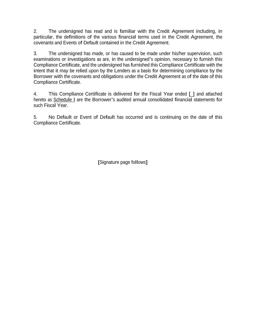 2. The undersigned has read and is familiar with the Credit Agreement including, in particular, the definitions of the various financial terms used in the Credit Agreement, the covenants and Events of Default contained in the Credit Agreement. 3. The undersigned has made, or has caused to be made under his/her supervision, such examinations or investigations as are, in the undersigned’s opinion, necessary to furnish this Compliance Certificate, and the undersigned has furnished this Compliance Certificate with the intent that it may be relied upon by the Lenders as a basis for determining compliance by the Borrower with the covenants and obligations under the Credit Agreement as of the date of this Compliance Certificate. 4. This Compliance Certificate is delivered for the Fiscal Year ended [_] and attached hereto as Schedule I are the Borrower’s audited annual consolidated financial statements for such Fiscal Year. 5. No Default or Event of Default has occurred and is continuing on the date of this Compliance Certificate. [Signature page follows]