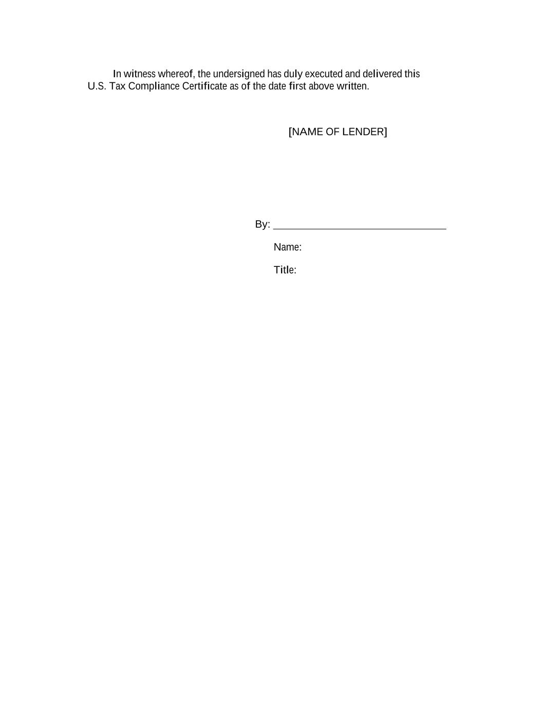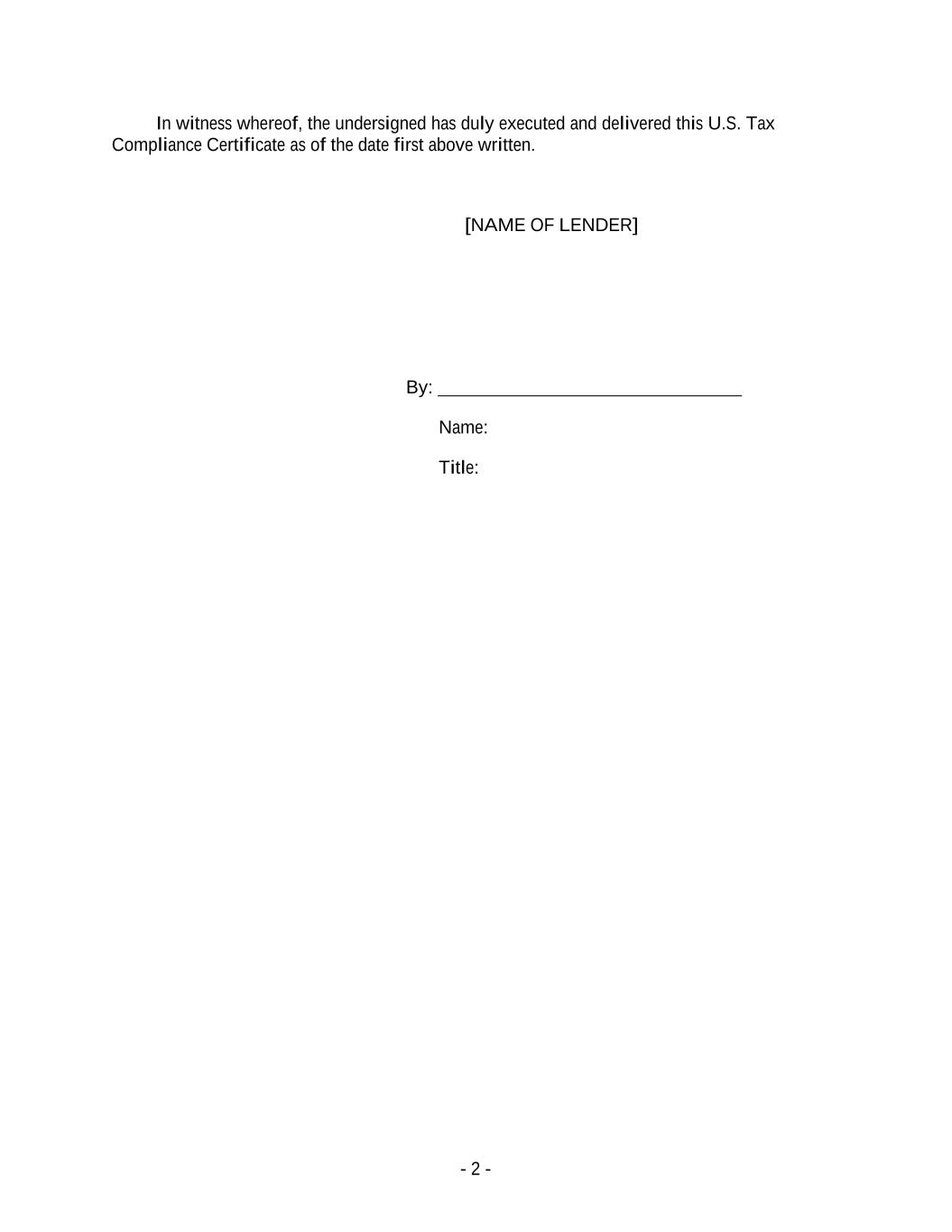 - 2 - In witness whereof, the undersigned has duly executed and delivered this U.S. Tax Compliance Certificate as of the date first above written. [NAME OF LENDER] By: Name: Title: