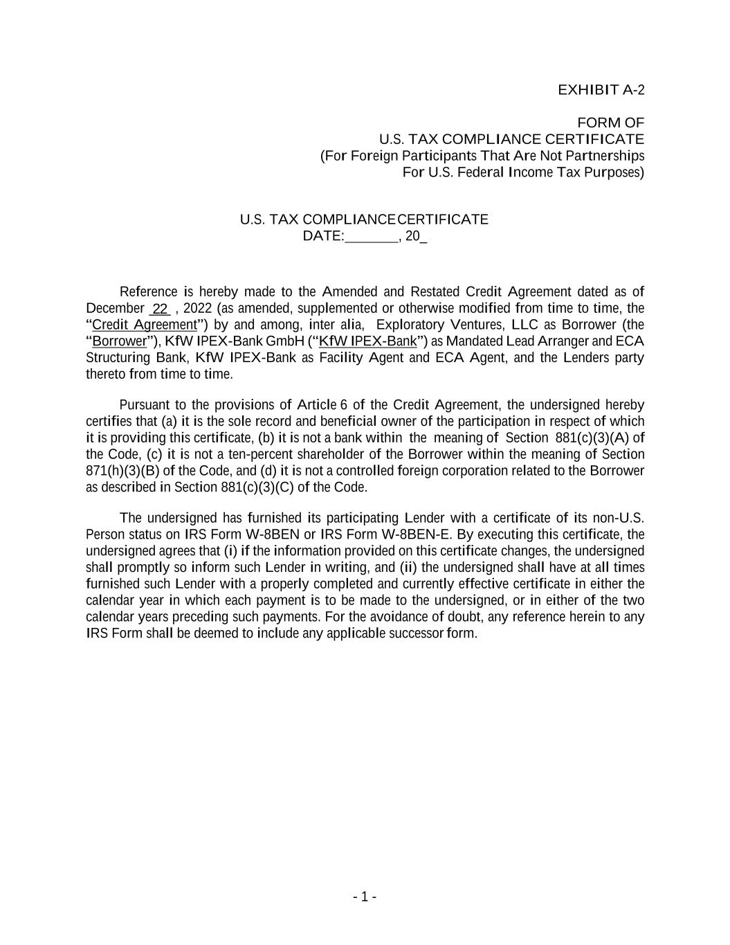 - 1 - EXHIBIT A-2 FORM OF U.S. TAX COMPLIANCE CERTIFICATE (For Foreign Participants That Are Not Partnerships For U.S. Federal Income Tax Purposes) U.S. TAX COMPLIANCE CERTIFICATE DATE: , 20_ Reference is hereby made to the Amended and Restated Credit Agreement dated as of December ___ , 2022 (as amended, supplemented or otherwise modified from time to time, the “Credit Agreement”) by and among, inter alia, Exploratory Ventures, LLC as Borrower (the “Borrower”), KfW IPEX-Bank GmbH (“KfW IPEX-Bank”) as Mandated Lead Arranger and ECA Structuring Bank, KfW IPEX-Bank as Facility Agent and ECA Agent, and the Lenders party thereto from time to time. Pursuant to the provisions of Article 6 of the Credit Agreement, the undersigned hereby certifies that (a) it is the sole record and beneficial owner of the participation in respect of which it is providing this certificate, (b) it is not a bank within the meaning of Section 881(c)(3)(A) of the Code, (c) it is not a ten-percent shareholder of the Borrower within the meaning of Section 871(h)(3)(B) of the Code, and (d) it is not a controlled foreign corporation related to the Borrower as described in Section 881(c)(3)(C) of the Code. The undersigned has furnished its participating Lender with a certificate of its non-U.S. Person status on IRS Form W-8BEN or IRS Form W-8BEN-E. By executing this certificate, the undersigned agrees that (i) if the information provided on this certificate changes, the undersigned shall promptly so inform such Lender in writing, and (ii) the undersigned shall have at all times furnished such Lender with a properly completed and currently effective certificate in either the calendar year in which each payment is to be made to the undersigned, or in either of the two calendar years preceding such payments. For the avoidance of doubt, any reference herein to any IRS Form shall be deemed to include any applicable successor form. 22