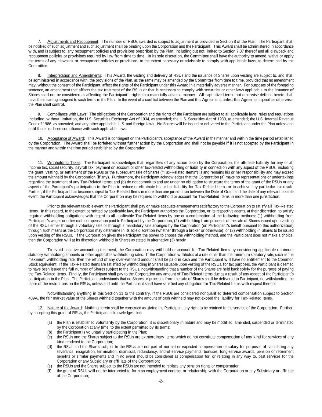 -2- 7. Adjustments and Recoupment: The number of RSUs awarded is subject to adjustment as provided in Section 8 of the Plan. The Participant shall be notified of such adjustment and such adjustment shall be binding upon the Corporation and the Participant. This Award shall be administered in accordance with, and is subject to, any recoupment policies and provisions prescribed by the Plan; including but not limited to Section 7.07 thereof and all clawback and recoupment policies or provisions required by law from time to time. In its sole discretion, the Committee shall have the authority to amend, waive or apply the terms of any clawback or recoupment policies or provisions, to the extent necessary or advisable to comply with applicable laws, as determined by the Committee. 8. Interpretation and Amendments: This Award, the vesting and delivery of RSUs and the issuance of Shares upon vesting are subject to, and shall be administered in accordance with, the provisions of the Plan, as the same may be amended by the Committee from time to time, provided that no amendment may, without the consent of the Participant, affect the rights of the Participant under this Award in a materially adverse manner. For purposes of the foregoing sentence, an amendment that affects the tax treatment of the RSUs or that is necessary to comply with securities or other laws applicable to the issuance of Shares shall not be considered as affecting the Participant’s rights in a materially adverse manner. All capitalized terms not otherwise defined herein shall have the meaning assigned to such terms in the Plan. In the event of a conflict between the Plan and this Agreement, unless this Agreement specifies otherwise, the Plan shall control. 9. Compliance with Laws: The obligations of the Corporation and the rights of the Participant are subject to all applicable laws, rules and regulations including, without limitation, the U.S. Securities Exchange Act of 1934, as amended; the U.S. Securities Act of 1933, as amended; the U.S. Internal Revenue Code of 1986, as amended; and any other applicable U.S. and foreign laws. No Shares will be issued or delivered to the Participant under the Plan unless and until there has been compliance with such applicable laws. 10. Acceptance of Award: This Award is contingent on the Participant’s acceptance of the Award in the manner and within the time period established by the Corporation. The Award shall be forfeited without further action by the Corporation and shall not be payable if it is not accepted by the Participant in the manner and within the time period established by the Corporation. 11. Withholding Taxes: The Participant acknowledges that, regardless of any action taken by the Corporation, the ultimate liability for any or all income tax, social security, payroll tax, payment on account or other tax-related withholding or liability in connection with any aspect of the RSUs, including the grant, vesting, or settlement of the RSUs or the subsequent sale of Shares (“Tax-Related Items”) is and remains his or her responsibility and may exceed the amount withheld by the Corporation (if any). Furthermore, the Participant acknowledges that the Corporation (a) make no representations or undertakings regarding the treatment of any Tax-Related Items; and (b) do not commit to and are under no obligation to structure the terms of the grant of the RSUs or any aspect of the Participant’s participation in the Plan to reduce or eliminate his or her liability for Tax-Related Items or to achieve any particular tax result. Further, if the Participant has become subject to Tax-Related Items in more than one jurisdiction between the Date of Grant and the date of any relevant taxable event, the Participant acknowledges that the Corporation may be required to withhold or account for Tax-Related Items in more than one jurisdiction. Prior to the relevant taxable event, the Participant shall pay or make adequate arrangements satisfactory to the Corporation to satisfy all Tax-Related Items. In this regard, to the extent permitted by applicable law, the Participant authorizes the Corporation, or its respective agents, at their discretion, to satisfy required withholding obligations with regard to all applicable Tax-Related Items by one or a combination of the following methods: (1) withholding from Participant’s wages or other cash compensation paid to Participant by the Corporation; (2) withholding from proceeds of the sale of Shares issued upon vesting of the RSUs either through a voluntary sale or through a mandatory sale arranged by the Corporation (on Participant’s behalf pursuant to this authorization) through such means as the Corporation may determine in its sole discretion (whether through a broker or otherwise); or (3) withholding in Shares to be issued upon vesting of the RSUs. If the Corporation gives the Participant the power to choose the withholding method, and the Participant does not make a choice, then the Corporation will at its discretion withhold in Shares as stated in alternative (3) herein. To avoid negative accounting treatment, the Corporation may withhold or account for Tax-Related Items by considering applicable minimum statutory withholding amounts or other applicable withholding rates. If the Corporation withholds at a rate other than the minimum statutory rate, such as the maximum withholding rate, then the refund of any over-withheld amount shall be paid in cash and the Participant will have no entitlement to the Common Stock equivalent. If the Tax-Related Items are satisfied by withholding in Shares issuable upon vesting of the RSUs, for tax purposes, the Participant is deemed to have been issued the full number of Shares subject to the RSUs, notwithstanding that a number of the Shares are held back solely for the purpose of paying the Tax-Related Items. Finally, the Participant shall pay to the Corporation any amount of Tax-Related Items due as a result 