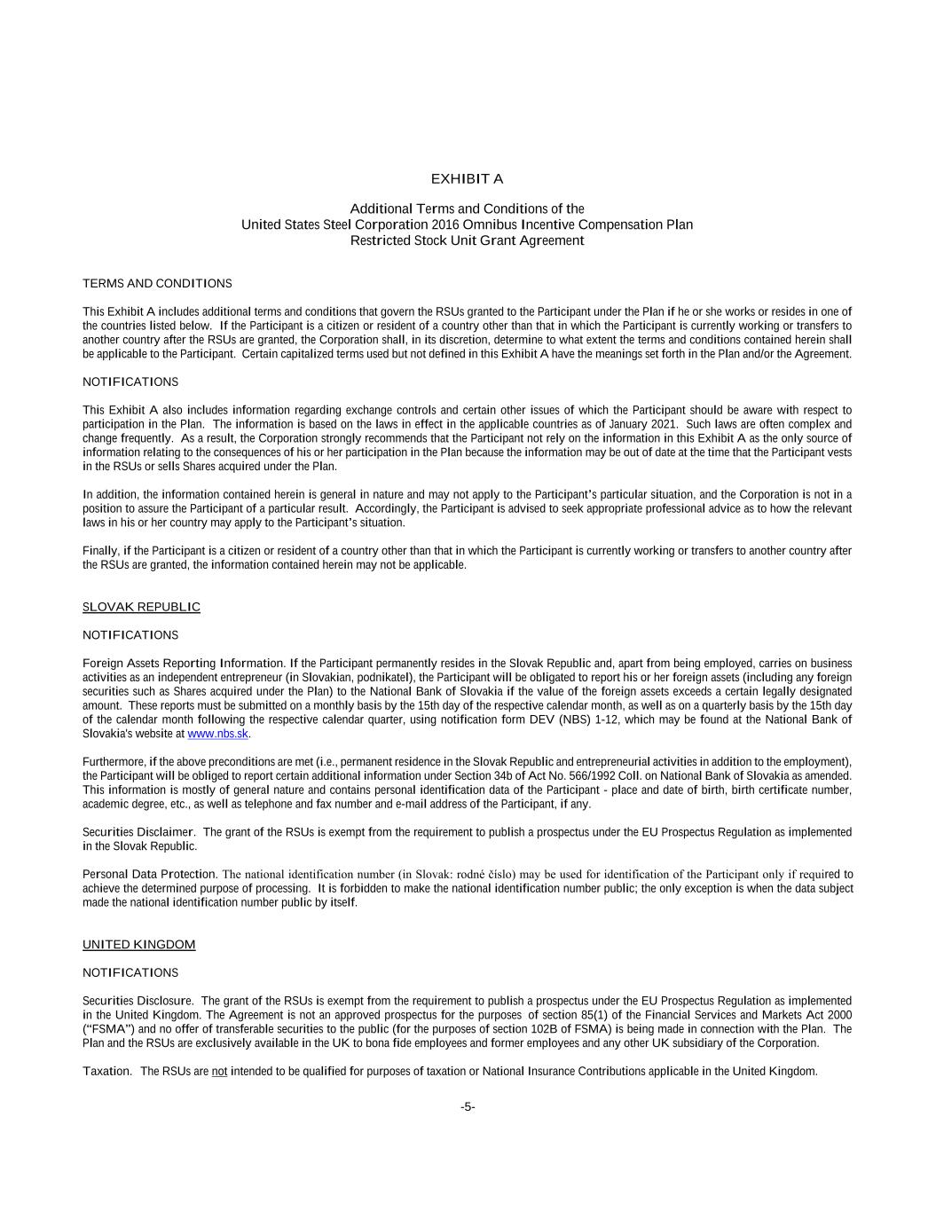 -5- EXHIBIT A Additional Terms and Conditions of the United States Steel Corporation 2016 Omnibus Incentive Compensation Plan Restricted Stock Unit Grant Agreement TERMS AND CONDITIONS This Exhibit A includes additional terms and conditions that govern the RSUs granted to the Participant under the Plan if he or she works or resides in one of the countries listed below. If the Participant is a citizen or resident of a country other than that in which the Participant is currently working or transfers to another country after the RSUs are granted, the Corporation shall, in its discretion, determine to what extent the terms and conditions contained herein shall be applicable to the Participant. Certain capitalized terms used but not defined in this Exhibit A have the meanings set forth in the Plan and/or the Agreement. NOTIFICATIONS This Exhibit A also includes information regarding exchange controls and certain other issues of which the Participant should be aware with respect to participation in the Plan. The information is based on the laws in effect in the applicable countries as of January 2021. Such laws are often complex and change frequently. As a result, the Corporation strongly recommends that the Participant not rely on the information in this Exhibit A as the only source of information relating to the consequences of his or her participation in the Plan because the information may be out of date at the time that the Participant vests in the RSUs or sells Shares acquired under the Plan. In addition, the information contained herein is general in nature and may not apply to the Participant’s particular situation, and the Corporation is not in a position to assure the Participant of a particular result. Accordingly, the Participant is advised to seek appropriate professional advice as to how the relevant laws in his or her country may apply to the Participant’s situation. Finally, if the Participant is a citizen or resident of a country other than that in which the Participant is currently working or transfers to another country after the RSUs are granted, the information contained herein may not be applicable. SLOVAK REPUBLIC NOTIFICATIONS Foreign Assets Reporting Information. If the Participant permanently resides in the Slovak Republic and, apart from being employed, carries on business activities as an independent entrepreneur (in Slovakian, podnikatel), the Participant will be obligated to report his or her foreign assets (including any foreign securities such as Shares acquired under the Plan) to the National Bank of Slovakia if the value of the foreign assets exceeds a certain legally designated amount. These reports must be submitted on a monthly basis by the 15th day of the respective calendar month, as well as on a quarterly basis by the 15th day of the calendar month following the respective calendar quarter, using notification form DEV (NBS) 1-12, which may be found at the National Bank of Slovakia's website at www.nbs.sk. Furthermore, if the above preconditions are met (i.e., permanent residence in the Slovak Republic and entrepreneurial activities in addition to the employment), the Participant will be obliged to report certain additional information under Section 34b of Act No. 566/1992 Coll. on National Bank of Slovakia as amended. This information is mostly of general nature and contains personal identification data of the Participant - place and date of birth, birth certificate number, academic degree, etc., as well as telephone and fax number and e-mail address of the Participant, if any. Securities Disclaimer. The grant of the RSUs is exempt from the requirement to publish a prospectus under the EU Prospectus Regulation as implemented in the Slovak Republic. Personal Data Protection. The national identification number (in Slovak: rodné číslo) may be used for identification of the Participant only if required to achieve the determined purpose of processing. It is forbidden to make the national identification number public; the only exception is when the data subject made the national identification number public by itself. UNITED KINGDOM NOTIFICATIONS Securities Disclosure. The grant of the RSUs is exempt from the requirement to publish a prospectus under the EU Prospectus Regulation as implemented in the United Kingdom. The Agreement is not an approved prospectus for the purposes of section 85(1) of the Financial Services and Markets Act 2000 (“FSMA”) and no offer of transferable securities to the public (for the purposes of section 102B of FSMA) is being made in connection with the Plan. The Plan and the RSUs are exclusively available in the UK to bona fide employees and former employees and any other UK subsidiary of the Corporation. Taxation. The RSUs are not intended to be qualified for purposes of taxation or National Insurance Contributions applicable in the United Kingdom.
