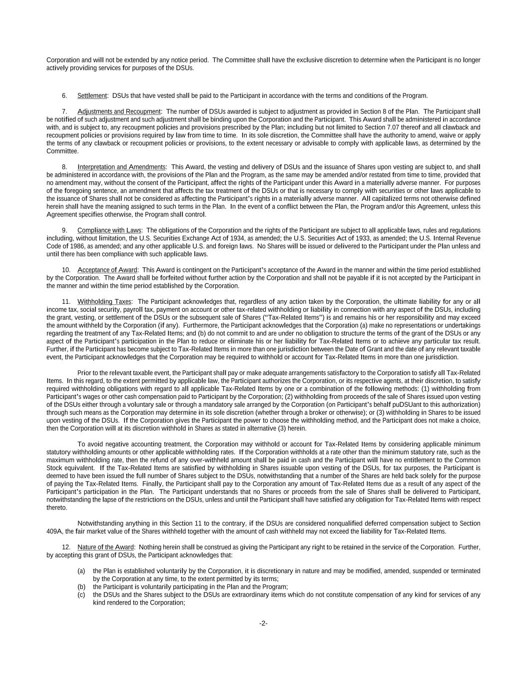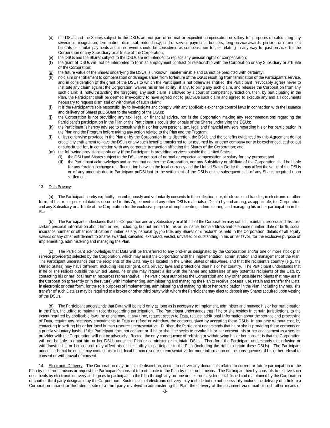 -3- (d) the DSUs and the Shares subject to the DSUs are not part of normal or expected compensation or salary for purposes of calculating any severance, resignation, termination, dismissal, redundancy, end-of-service payments, bonuses, long-service awards, pension or retirement benefits or similar payments and in no event should be considered as compensation for, or relating in any way to, past services for the Corporation or any Subsidiary or affiliate of the Corporation; (e) the DSUs and the Shares subject to the DSUs are not intended to replace any pension rights or compensation; (f) the grant of DSUs will not be interpreted to form an employment contract or relationship with the Corporation or any Subsidiary or affiliate of the Corporation; (g) the future value of the Shares underlying the DSUs is unknown, indeterminable and cannot be predicted with certainty; (h) no claim or entitlement to compensation or damages arises from forfeiture of the DSUs resulting from termination of the Participant’s service, and in consideration of the grant of the DSUs to which the Participant is not otherwise entitled, the Participant irrevocably agrees never to institute any claim against the Corporation, waives his or her ability, if any, to bring any such claim, and releases the Corporation from any such claim; if, notwithstanding the foregoing, any such claim is allowed by a court of competent jurisdiction, then, by participating in the Plan, the Participant shall be deemed irrevocably to have agreed not to puDSUe such claim and agreed to execute any and all documents necessary to request dismissal or withdrawal of such claim; (i) it is the Participant’s sole responsibility to investigate and comply with any applicable exchange control laws in connection with the issuance and delivery of Shares puDSUant to the vesting of the DSUs; (j) the Corporation is not providing any tax, legal or financial advice, nor is the Corporation making any recommendations regarding the Participant’s participation in the Plan or the Participant’s acquisition or sale of the Shares underlying the DSUs; (k) the Participant is hereby advised to consult with his or her own personal tax, legal and financial advisors regarding his or her participation in the Plan and the Program before taking any action related to the Plan and the Program; (l) unless otherwise provided in the Plan or by the Corporation in its discretion, the DSUs and the benefits evidenced by this Agreement do not create any entitlement to have the DSUs or any such benefits transferred to, or assumed by, another company nor to be exchanged, cashed out or substituted for, in connection with any corporate transaction affecting the Shares of the Corporation; and (m) the following provisions apply only if the Participant is providing services outside the United States: (i) the DSU and Shares subject to the DSU are not part of normal or expected compensation or salary for any purpose; and (ii) the Participant acknowledges and agrees that neither the Corporation, nor any Subsidiary or affiliate of the Corporation shall be liable for any foreign exchange rate fluctuation between the local currency and the United States Dollar that may affect the value of the DSUs or of any amounts due to Participant puDSUant to the settlement of the DSUs or the subsequent sale of any Shares acquired upon settlement. 13. Data Privacy: (a) The Participant hereby explicitly, unambiguously and voluntarily consents to the collection, use, disclosure and transfer, in electronic or other form, of his or her personal data as described in this Agreement and any other DSUs materials (“Data”) by and among, as applicable, the Corporation and any Subsidiary or affiliate of the Corporation for the exclusive purpose of implementing, administering, and managing his or her participation in the Plan. (b) The Participant understands that the Corporation and any Subsidiary or affiliate of the Corporation may collect, maintain, process and disclose certain personal information about him or her, including, but not limited to, his or her name, home address and telephone number, date of birth, social insurance number or other identification number, salary, nationality, job title, any Shares or directorships held in the Corporation, details of all equity awards or any other entitlement to Shares awarded, canceled, exercised, vested, unvested or outstanding in his or her favor, for the exclusive purpose of implementing, administering and managing the Plan. (c) The Participant acknowledges that Data will be transferred to any broker as designated by the Corporation and/or one or more stock plan service provider(s) selected by the Corporation, which may assist the Corporation with the implementation, administration and management of the Plan. The Participant understands that the recipients of the Data may be located in the United States or elsewhere, and that the recipient’s country (e.g., the United States) may have different, including less stringent, data privacy laws and protections than his or her country. The Participant understands that if he or she resides outside the United States, he or she may request a list with the names and addresses of any potential recipients of the Data by contacting his or her local human resources representative. The Participant authorizes the Corporation and any other possible recipients that may assist the Corporation (presently or in the future) with implementing, administering and managing the Plan to receive, possess, use, retain and transfer the Data, in electronic or other form, for the sole purposes of implementing, administering and managing his or her participation in the Plan, including any requisite transfer of such Data as may be required to a broker or other third party with whom the Participant may elect to deposit any Shares acquired upon vesting of the DSUs. (d) The Participant understands that Data will be held only as long as is necessary to i