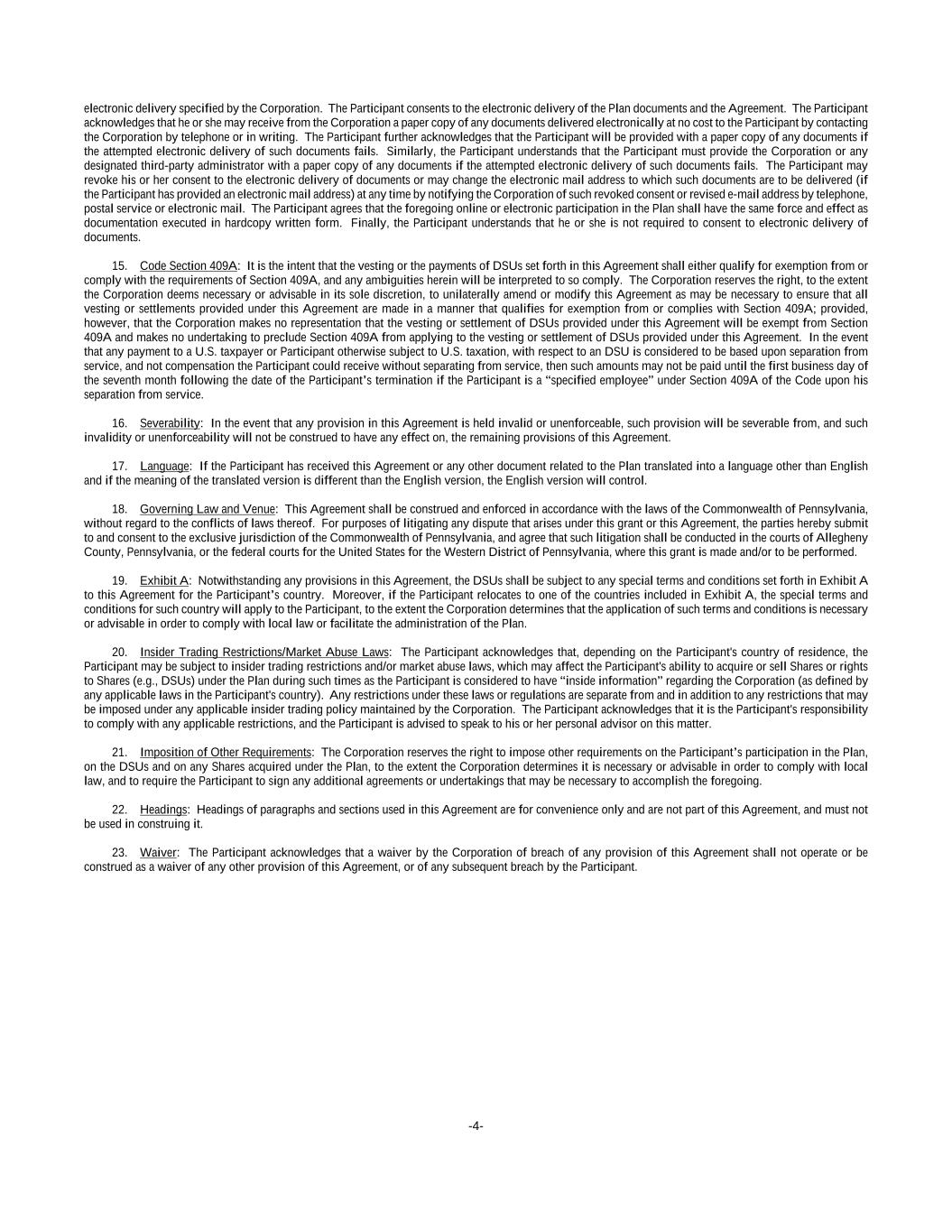 -4- electronic delivery specified by the Corporation. The Participant consents to the electronic delivery of the Plan documents and the Agreement. The Participant acknowledges that he or she may receive from the Corporation a paper copy of any documents delivered electronically at no cost to the Participant by contacting the Corporation by telephone or in writing. The Participant further acknowledges that the Participant will be provided with a paper copy of any documents if the attempted electronic delivery of such documents fails. Similarly, the Participant understands that the Participant must provide the Corporation or any designated third-party administrator with a paper copy of any documents if the attempted electronic delivery of such documents fails. The Participant may revoke his or her consent to the electronic delivery of documents or may change the electronic mail address to which such documents are to be delivered (if the Participant has provided an electronic mail address) at any time by notifying the Corporation of such revoked consent or revised e-mail address by telephone, postal service or electronic mail. The Participant agrees that the foregoing online or electronic participation in the Plan shall have the same force and effect as documentation executed in hardcopy written form. Finally, the Participant understands that he or she is not required to consent to electronic delivery of documents. 15. Code Section 409A: It is the intent that the vesting or the payments of DSUs set forth in this Agreement shall either qualify for exemption from or comply with the requirements of Section 409A, and any ambiguities herein will be interpreted to so comply. The Corporation reserves the right, to the extent the Corporation deems necessary or advisable in its sole discretion, to unilaterally amend or modify this Agreement as may be necessary to ensure that all vesting or settlements provided under this Agreement are made in a manner that qualifies for exemption from or complies with Section 409A; provided, however, that the Corporation makes no representation that the vesting or settlement of DSUs provided under this Agreement will be exempt from Section 409A and makes no undertaking to preclude Section 409A from applying to the vesting or settlement of DSUs provided under this Agreement. In the event that any payment to a U.S. taxpayer or Participant otherwise subject to U.S. taxation, with respect to an DSU is considered to be based upon separation from service, and not compensation the Participant could receive without separating from service, then such amounts may not be paid until the first business day of the seventh month following the date of the Participant’s termination if the Participant is a “specified employee” under Section 409A of the Code upon his separation from service. 16. Severability: In the event that any provision in this Agreement is held invalid or unenforceable, such provision will be severable from, and such invalidity or unenforceability will not be construed to have any effect on, the remaining provisions of this Agreement. 17. Language: If the Participant has received this Agreement or any other document related to the Plan translated into a language other than English and if the meaning of the translated version is different than the English version, the English version will control. 18. Governing Law and Venue: This Agreement shall be construed and enforced in accordance with the laws of the Commonwealth of Pennsylvania, without regard to the conflicts of laws thereof. For purposes of litigating any dispute that arises under this grant or this Agreement, the parties hereby submit to and consent to the exclusive jurisdiction of the Commonwealth of Pennsylvania, and agree that such litigation shall be conducted in the courts of Allegheny County, Pennsylvania, or the federal courts for the United States for the Western District of Pennsylvania, where this grant is made and/or to be performed. 19. Exhibit A: Notwithstanding any provisions in this Agreement, the DSUs shall be subject to any special terms and conditions set forth in Exhibit A to this Agreement for the Participant’s country. Moreover, if the Participant relocates to one of the countries included in Exhibit A, the special terms and conditions for such country will apply to the Participant, to the extent the Corporation determines that the application of such terms and conditions is necessary or advisable in order to comply with local law or facilitate the administration of the Plan. 20. Insider Trading Restrictions/Market Abuse Laws: The Participant acknowledges that, depending on the Participant's country of residence, the Participant may be subject to insider trading restrictions and/or market abuse laws, which may affect the Participant's ability to acquire or sell Shares or rights to Shares (e.g., DSUs) under the Plan during such times as the Participant is considered to have “inside information” regarding the Corporation (as defined by any applicable laws in the Participant's country). Any restrictions under these laws or regulations are separate from and in addition to any restrictions that may be imposed under any applicable insider trading policy maintained by the Corporation. The Participant acknowledges that it is the Participant's responsibility to comply with any applicable restrictions, and the Participant is advised to speak to his or her personal advisor on this matter. 21. Imposition of Other Requirements: The Corporation reserves the right to impose other requirements on the Participant’s participation in the Plan, on the DSUs and on any Shares acquired under the Plan, to the extent the Corporation determines it is necessary or advisable in order to comply with local law, and to require the Participant to sign any additional agreements or undertakings that may be necessary to accomplish the foregoing. 22. Headings: Headings of paragraphs and sections used in t