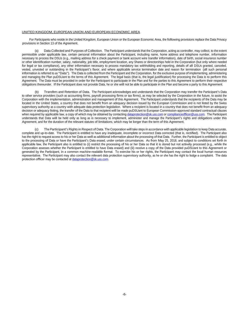-6- UNITED KINGDOM, EUROPEAN UNION AND EUROPEAN ECONOMIC AREA For Participants who reside in the United Kingdom, European Union or the European Economic Area, the following provisions replace the Data Privacy provisions in Section 13 of the Agreement. (a) Data Collected and Purposes of Collection. The Participant understands that the Corporation, acting as controller, may collect, to the extent permissible under applicable law, certain personal information about the Participant, including name, home address and telephone number, information necessary to process the DSUs (e.g., mailing address for a check payment or bank account wire transfer information), date of birth, social insurance number or other identification number, salary, nationality, job title, employment location, any Shares or directorships held in the Corporation (but only where needed for legal or tax compliance), any other information necessary to process mandatory tax withholding and reporting, details of all DSUs granted, canceled, vested, unvested or outstanding in the Participant’s favor, and where applicable service termination date and reason for termination (all such personal information is referred to as “Data”). The Data is collected from the Participant and the Corporation, for the exclusive purpose of implementing, administering and managing the Plan puDSUant to the terms of this Agreement. The legal basis (that is, the legal justification) for processing the Data is to perform this Agreement. The Data must be provided in order for the Participant to participate in the Plan and for the parties to this Agreement to perform their respective obligations thereunder. If the Participant does not provide Data, he or she will not be able to participate in the Plan and become a party to this Agreement. (b) Transfers and Retention of Data. The Participant acknowledges and understands that the Corporation may transfer the Participant’s Data to other service providers (such as accounting firms, payroll processing firms or tax firms), as may be selected by the Corporation in the future, to assist the Corporation with the implementation, administration and management of this Agreement. The Participant understands that the recipients of the Data may be located in the United States, a country that does not benefit from an adequacy decision issued by the European Commission and is not listed by the Swiss supervisory authority as a country with adequate data protection legislation. Where a recipient is located in a country that does not benefit from an adequacy decision or adequacy listing, the transfer of the Data to that recipient will be made puDSUant to European Commission-approved standard contractual clauses when required by applicable law, a copy of which may be obtained by contacting dataprotection@sk.uss.com or complianceofficer@uss.com. The Participant understands that Data will be held only as long as is necessary to implement, administer and manage the Participant’s rights and obligations under this Agreement, and for the duration of the relevant statutes of limitations, which may be longer than the term of this Agreement. (c) The Participant’s Rights in Respect of Data. The Corporation will take steps in accordance with applicable legislation to keep Data accurate, complete and up-to-date. The Participant is entitled to have any inadequate, incomplete or incorrect Data corrected (that is, rectified). The Participant also has the right to request access to his or her Data as well as additional information about the processing of that Data. Further, the Participant is entitled to object to the processing of Data or have the Participant’s Data erased, under certain circumstances. As from May 25, 2018, and subject to conditions set forth in applicable law, the Participant also is entitled to (i) restrict the processing of his or her Data so that it is stored but not actively processed (e.g., while the Corporation assesses whether the Participant is entitled to have Data erased) and (ii) receive a copy of the Data provided puDSUant to this Agreement or generated by the Participant, in a common machine-readable format. To exercise his or her rights, the Participant may contact the local human resources representative. The Participant may also contact the relevant data protection supervisory authority, as he or she has the right to lodge a complaint. The data protection officer may be contacted at dataprotection@sk.uss.com.