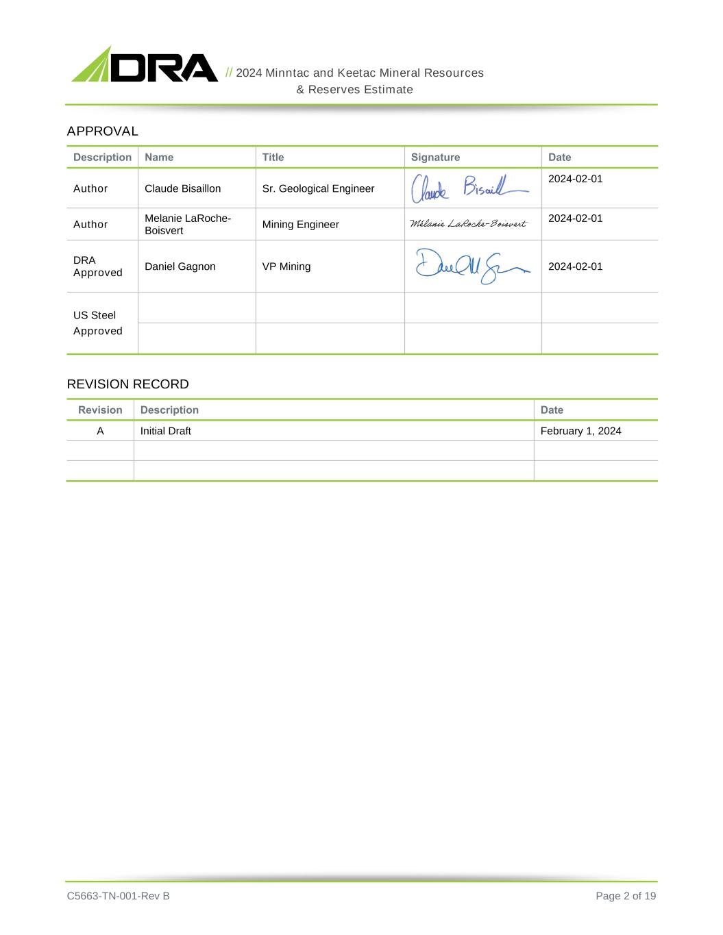 // 2024 Minntac and Keetac Mineral Resources & Reserves Estimate C5663-TN-001-Rev B Page 2 of 19 APPROVAL Description Name Title Signature Date Author Claude Bisaillon Sr. Geological Engineer 2024-02-01 Author Melanie LaRoche- Boisvert Mining Engineer 2024-02-01 DRA Approved Daniel Gagnon VP Mining 2024-02-01 US Steel Approved REVISION RECORD Revision Description Date A Initial Draft February 1, 2024