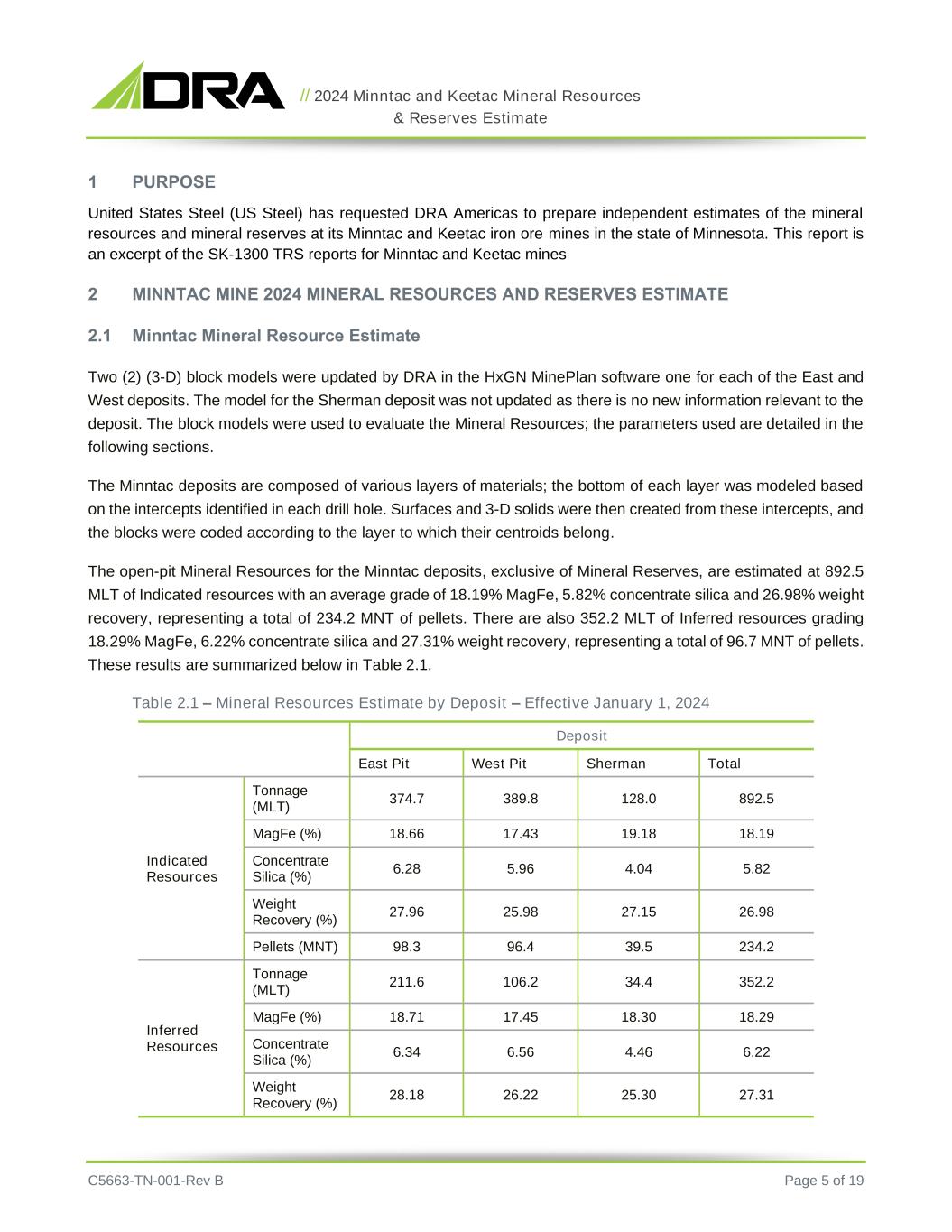 // 2024 Minntac and Keetac Mineral Resources & Reserves Estimate C5663-TN-001-Rev B Page 5 of 19 1 PURPOSE United States Steel (US Steel) has requested DRA Americas to prepare independent estimates of the mineral resources and mineral reserves at its Minntac and Keetac iron ore mines in the state of Minnesota. This report is an excerpt of the SK-1300 TRS reports for Minntac and Keetac mines 2 MINNTAC MINE 2024 MINERAL RESOURCES AND RESERVES ESTIMATE 2.1 Minntac Mineral Resource Estimate Two (2) (3-D) block models were updated by DRA in the HxGN MinePlan software one for each of the East and West deposits. The model for the Sherman deposit was not updated as there is no new information relevant to the deposit. The block models were used to evaluate the Mineral Resources; the parameters used are detailed in the following sections. The Minntac deposits are composed of various layers of materials; the bottom of each layer was modeled based on the intercepts identified in each drill hole. Surfaces and 3-D solids were then created from these intercepts, and the blocks were coded according to the layer to which their centroids belong. The open-pit Mineral Resources for the Minntac deposits, exclusive of Mineral Reserves, are estimated at 892.5 MLT of Indicated resources with an average grade of 18.19% MagFe, 5.82% concentrate silica and 26.98% weight recovery, representing a total of 234.2 MNT of pellets. There are also 352.2 MLT of Inferred resources grading 18.29% MagFe, 6.22% concentrate silica and 27.31% weight recovery, representing a total of 96.7 MNT of pellets. These results are summarized below in Table 2.1. Table 2.1 – Mineral Resources Estimate by Deposit – Effective January 1, 2024 Deposit East Pit West Pit Sherman Total Indicated Resources Tonnage (MLT) 374.7 389.8 128.0 892.5 MagFe (%) 18.66 17.43 19.18 18.19 Concentrate Silica (%) 6.28 5.96 4.04 5.82 Weight Recovery (%) 27.96 25.98 27.15 26.98 Pellets (MNT) 98.3 96.4 39.5 234.2 Inferred Resources Tonnage (MLT) 211.6 106.2 34.4 352.2 MagFe (%) 18.71 17.45 18.30 18.29 Concentrate Silica (%) 6.34 6.56 4.46 6.22 Weight Recovery (%) 28.18 26.22 25.30 27.31