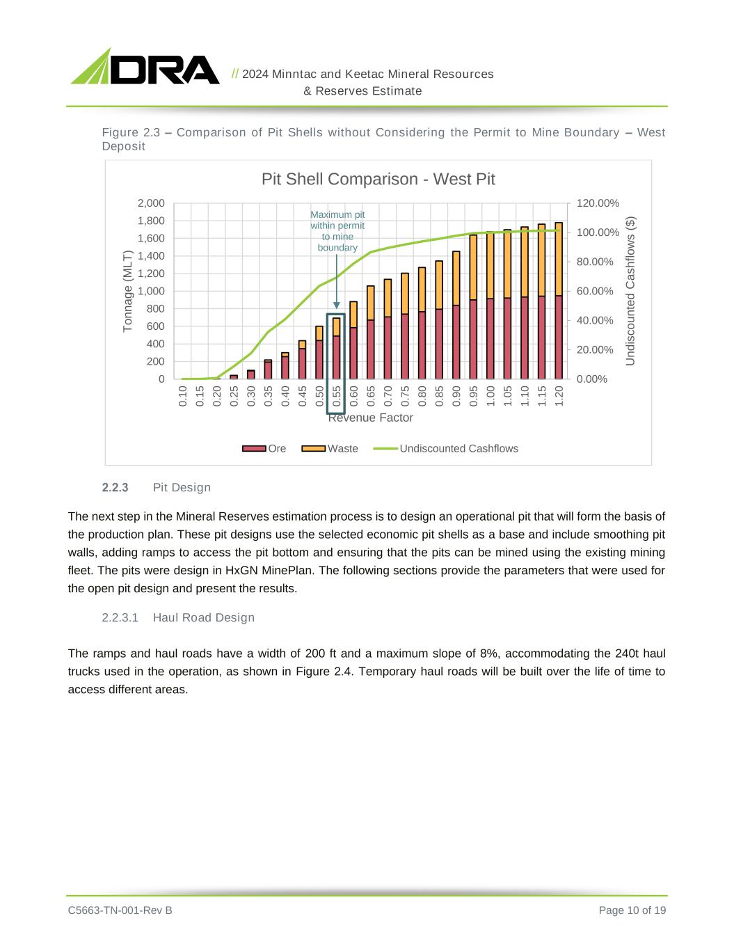 // 2024 Minntac and Keetac Mineral Resources & Reserves Estimate C5663-TN-001-Rev B Page 10 of 19 Figure 2.3 – Comparison of Pit Shells without Considering the Permit to Mine Boundary – West Deposit Pit Design The next step in the Mineral Reserves estimation process is to design an operational pit that will form the basis of the production plan. These pit designs use the selected economic pit shells as a base and include smoothing pit walls, adding ramps to access the pit bottom and ensuring that the pits can be mined using the existing mining fleet. The pits were design in HxGN MinePlan. The following sections provide the parameters that were used for the open pit design and present the results. 2.2.3.1 Haul Road Design The ramps and haul roads have a width of 200 ft and a maximum slope of 8%, accommodating the 240t haul trucks used in the operation, as shown in Figure 2.4. Temporary haul roads will be built over the life of time to access different areas. 0.00% 20.00% 40.00% 60.00% 80.00% 100.00% 120.00% 0 200 400 600 800 1,000 1,200 1,400 1,600 1,800 2,000 0 .1 0 0 .1 5 0 .2 0 0 .2 5 0 .3 0 0 .3 5 0 .4 0 0 .4 5 0 .5 0 0 .5 5 0 .6 0 0 .6 5 0 .7 0 0 .7 5 0 .8 0 0 .8 5 0 .9 0 0 .9 5 1 .0 0 1 .0 5 1 .1 0 1 .1 5 1 .2 0 U n d is c o u n te d C a s h fl o w s ( $ ) T o n n a g e ( M L T ) Revenue Factor Pit Shell Comparison - West Pit Ore Waste Undiscounted Cashflows Maximum pit within permit to mine boundary