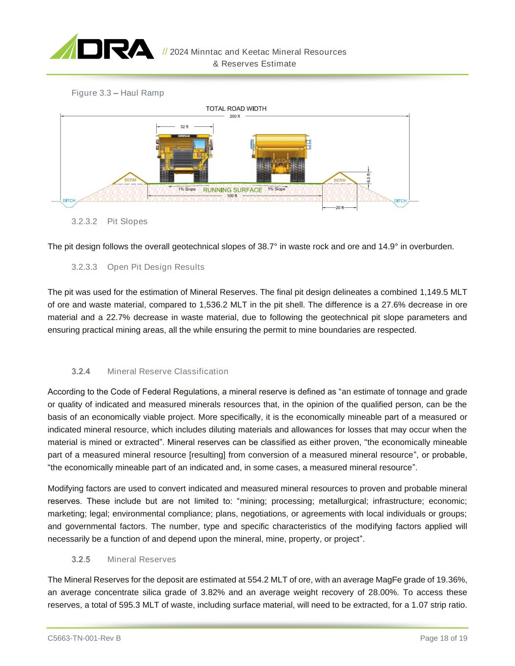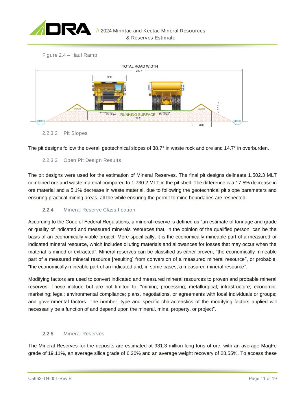 // 2024 Minntac and Keetac Mineral Resources & Reserves Estimate C5663-TN-001-Rev B Page 11 of 19 Figure 2.4 – Haul Ramp 2.2.3.2 Pit Slopes The pit designs follow the overall geotechnical slopes of 38.7° in waste rock and ore and 14.7° in overburden. 2.2.3.3 Open Pit Design Results The pit designs were used for the estimation of Mineral Reserves. The final pit designs delineate 1,502.3 MLT combined ore and waste material compared to 1,730.2 MLT in the pit shell. The difference is a 17.5% decrease in ore material and a 5.1% decrease in waste material, due to following the geotechnical pit slope parameters and ensuring practical mining areas, all the while ensuring the permit to mine boundaries are respected. Mineral Reserve Classification According to the Code of Federal Regulations, a mineral reserve is defined as “an estimate of tonnage and grade or quality of indicated and measured minerals resources that, in the opinion of the qualified person, can be the basis of an economically viable project. More specifically, it is the economically mineable part of a measured or indicated mineral resource, which includes diluting materials and allowances for losses that may occur when the material is mined or extracted”. Mineral reserves can be classified as either proven, "the economically mineable part of a measured mineral resource [resulting] from conversion of a measured mineral resource”, or probable, “the economically mineable part of an indicated and, in some cases, a measured mineral resource”. Modifying factors are used to convert indicated and measured mineral resources to proven and probable mineral reserves. These include but are not limited to: “mining; processing; metallurgical; infrastructure; economic; marketing; legal; environmental compliance; plans, negotiations, or agreements with local individuals or groups; and governmental factors. The number, type and specific characteristics of the modifying factors applied will necessarily be a function of and depend upon the mineral, mine, property, or project”. Mineral Reserves The Mineral Reserves for the deposits are estimated at 931.3 million long tons of ore, with an average MagFe grade of 19.11%, an average silica grade of 6.20% and an average weight recovery of 28.55%. To access these