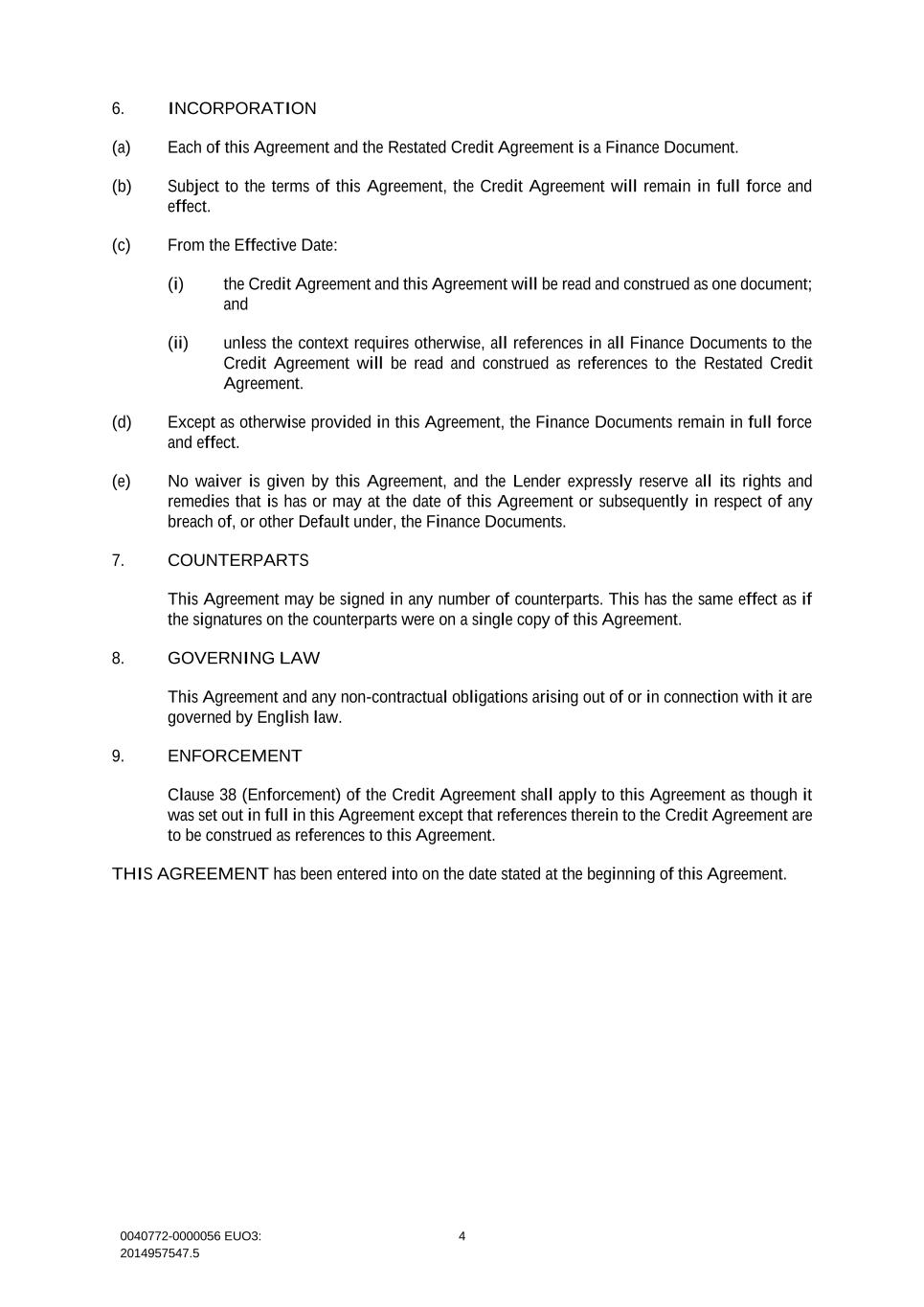 0040772-0000056 EUO3: 2014957547.5 4 6. INCORPORATION (a) Each of this Agreement and the Restated Credit Agreement is a Finance Document. (b) Subject to the terms of this Agreement, the Credit Agreement will remain in full force and effect. (c) From the Effective Date: (i) the Credit Agreement and this Agreement will be read and construed as one document; and (ii) unless the context requires otherwise, all references in all Finance Documents to the Credit Agreement will be read and construed as references to the Restated Credit Agreement. (d) Except as otherwise provided in this Agreement, the Finance Documents remain in full force and effect. (e) No waiver is given by this Agreement, and the Lender expressly reserve all its rights and remedies that is has or may at the date of this Agreement or subsequently in respect of any breach of, or other Default under, the Finance Documents. 7. COUNTERPARTS This Agreement may be signed in any number of counterparts. This has the same effect as if the signatures on the counterparts were on a single copy of this Agreement. 8. GOVERNING LAW This Agreement and any non-contractual obligations arising out of or in connection with it are governed by English law. 9. ENFORCEMENT Clause 38 (Enforcement) of the Credit Agreement shall apply to this Agreement as though it was set out in full in this Agreement except that references therein to the Credit Agreement are to be construed as references to this Agreement. THIS AGREEMENT has been entered into on the date stated at the beginning of this Agreement.