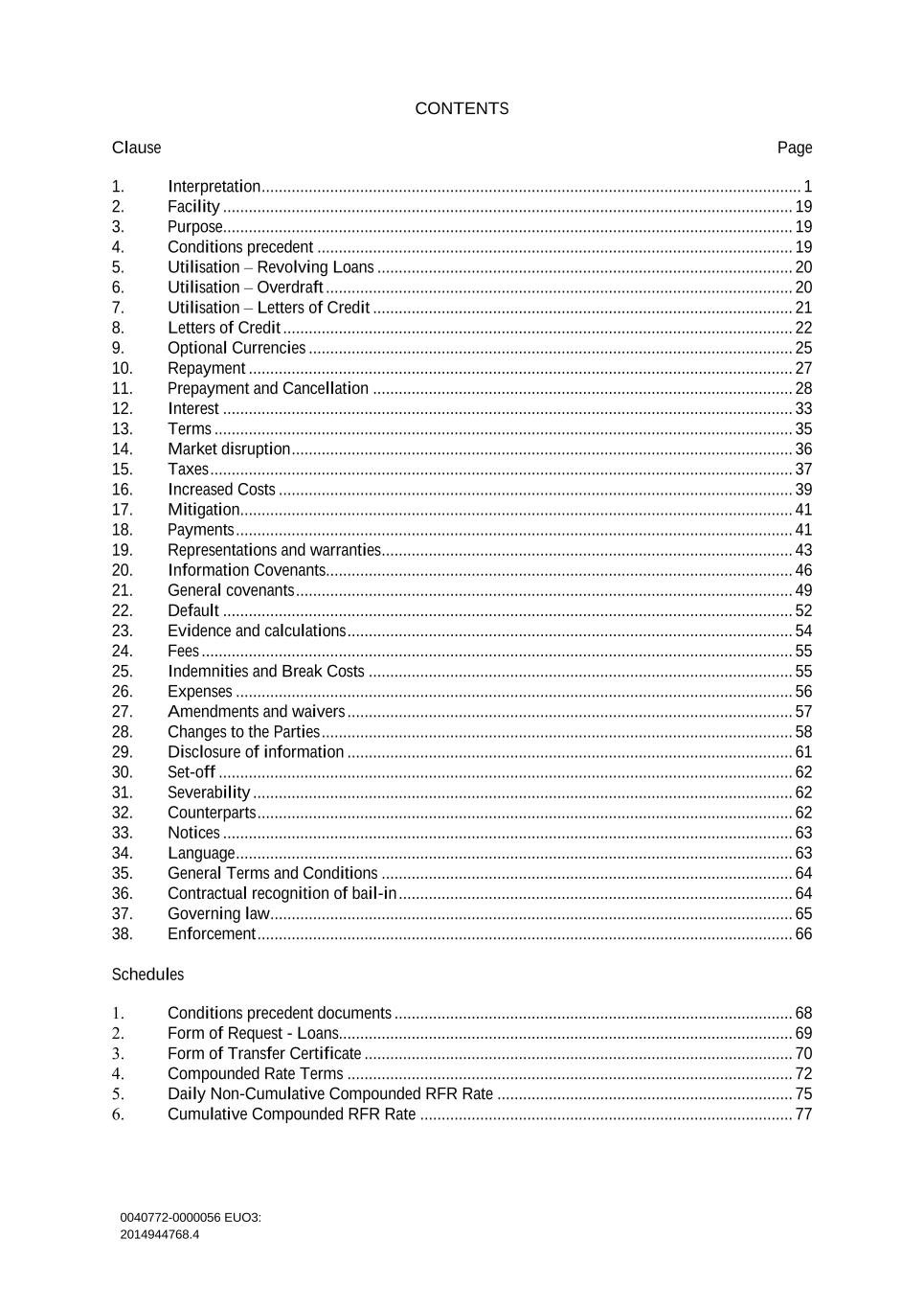 0040772-0000056 EUO3: 2014944768.4 CONTENTS Clause Page 1. Interpretation .............................................................................................................................. 1 2. Facility ..................................................................................................................................... 19 3. Purpose ..................................................................................................................................... 19 4. Conditions precedent ............................................................................................................... 19 5. Utilisation – Revolving Loans ................................................................................................. 20 6. Utilisation – Overdraft ............................................................................................................. 20 7. Utilisation – Letters of Credit .................................................................................................. 21 8. Letters of Credit ....................................................................................................................... 22 9. Optional Currencies ................................................................................................................. 25 10. Repayment ............................................................................................................................... 27 11. Prepayment and Cancellation .................................................................................................. 28 12. Interest ..................................................................................................................................... 33 13. Terms ....................................................................................................................................... 35 14. Market disruption ..................................................................................................................... 36 15. Taxes ........................................................................................................................................ 37 16. Increased Costs ........................................................................................................................ 39 17. Mitigation ................................................................................................................................. 41 18. Payments .................................................................................................................................. 41 19. Representations and warranties ................................................................................................ 43 20. Information Covenants............................................................................................................. 46 21. General covenants .................................................................................................................... 49 22. Default ..................................................................................................................................... 52 23. Evidence and calculations ........................................................................................................ 54 24. Fees .......................................................................................................................................... 55 25. Indemnities and Break Costs ................................................................................................... 55 26. Expenses .................................................................................................................................. 56 27. Amendments and waivers ........................................................................................................ 57 28. Changes to the Parties .............................................................................................................. 58 29. Disclosure of information ........................................................................................................ 61 30. Set-off ...................................................................................................................................... 62 31. Severability .............................................................................................................................. 62 32. Counterparts ............................................................................................................................. 62 33. Notices ..................................................................................................................................... 63 34. Language .................................................................................................................................. 63 35. General Terms and Conditions ................................................................................................ 64 36. Contractual recognition of bail-in ............................................................................................ 64 37. Governing law .......................................................................................................................... 65 38. Enforcement ............................................................................................................................. 66 Schedules 1. Conditions precedent documents ............................................................................................. 68 2. Form of Request - Loans.......................................................................................................... 69 3. Form of Transfer Certificate .................................................................................................... 70 4. Compounded Rate Terms ...................................................................