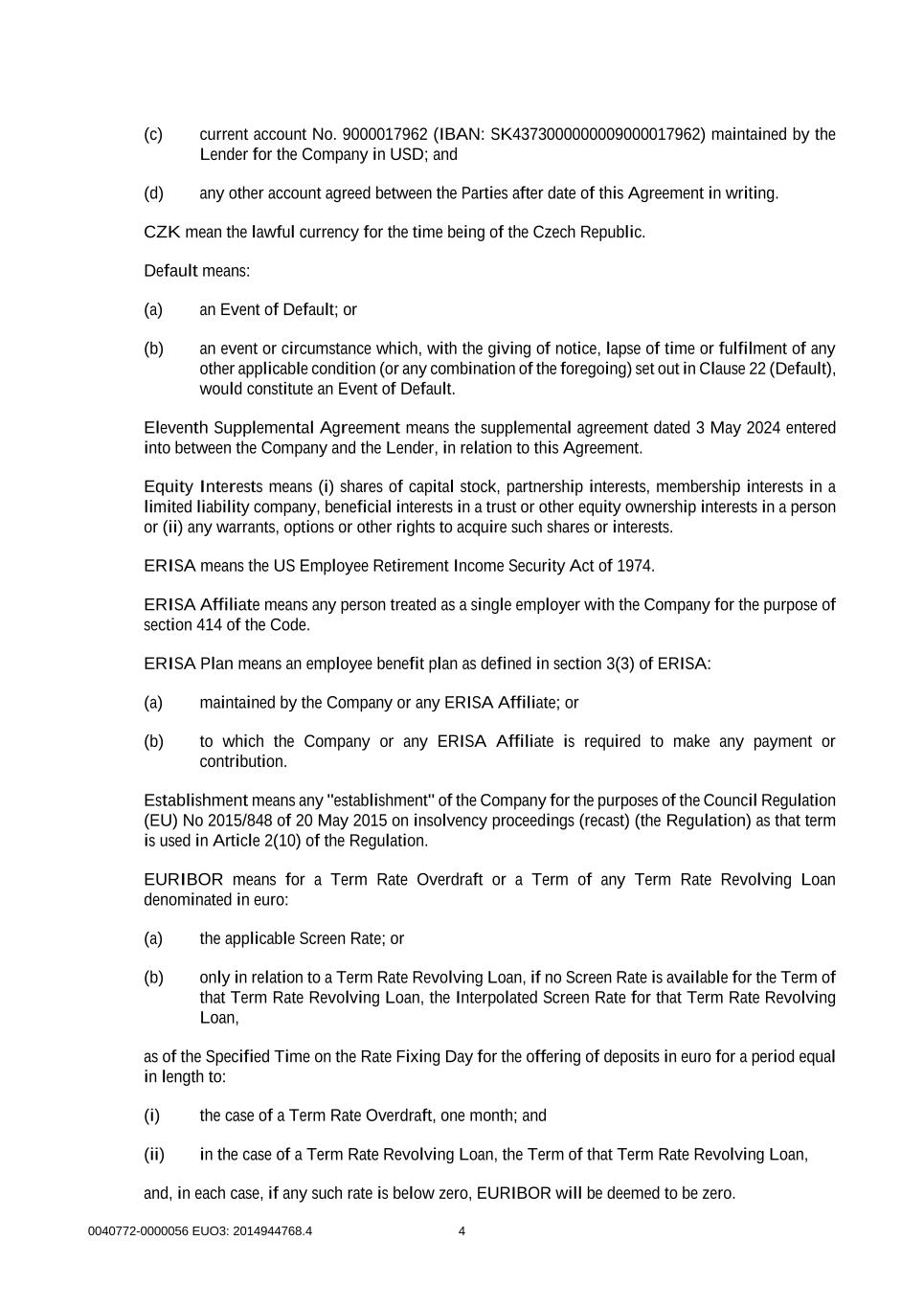0040772-0000056 EUO3: 2014944768.4 4 (c) current account No. 9000017962 (IBAN: SK4373000000009000017962) maintained by the Lender for the Company in USD; and (d) any other account agreed between the Parties after date of this Agreement in writing. CZK mean the lawful currency for the time being of the Czech Republic. Default means: (a) an Event of Default; or (b) an event or circumstance which, with the giving of notice, lapse of time or fulfilment of any other applicable condition (or any combination of the foregoing) set out in Clause 22 (Default), would constitute an Event of Default. Eleventh Supplemental Agreement means the supplemental agreement dated 3 May 2024 entered into between the Company and the Lender, in relation to this Agreement. Equity Interests means (i) shares of capital stock, partnership interests, membership interests in a limited liability company, beneficial interests in a trust or other equity ownership interests in a person or (ii) any warrants, options or other rights to acquire such shares or interests. ERISA means the US Employee Retirement Income Security Act of 1974. ERISA Affiliate means any person treated as a single employer with the Company for the purpose of section 414 of the Code. ERISA Plan means an employee benefit plan as defined in section 3(3) of ERISA: (a) maintained by the Company or any ERISA Affiliate; or (b) to which the Company or any ERISA Affiliate is required to make any payment or contribution. Establishment means any "establishment" of the Company for the purposes of the Council Regulation (EU) No 2015/848 of 20 May 2015 on insolvency proceedings (recast) (the Regulation) as that term is used in Article 2(10) of the Regulation. EURIBOR means for a Term Rate Overdraft or a Term of any Term Rate Revolving Loan denominated in euro: (a) the applicable Screen Rate; or (b) only in relation to a Term Rate Revolving Loan, if no Screen Rate is available for the Term of that Term Rate Revolving Loan, the Interpolated Screen Rate for that Term Rate Revolving Loan, as of the Specified Time on the Rate Fixing Day for the offering of deposits in euro for a period equal in length to: (i) the case of a Term Rate Overdraft, one month; and (ii) in the case of a Term Rate Revolving Loan, the Term of that Term Rate Revolving Loan, and, in each case, if any such rate is below zero, EURIBOR will be deemed to be zero.
