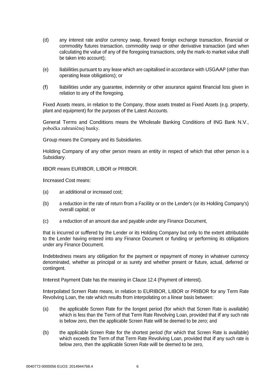 0040772-0000056 EUO3: 2014944768.4 6 (d) any interest rate and/or currency swap, forward foreign exchange transaction, financial or commodity futures transaction, commodity swap or other derivative transaction (and when calculating the value of any of the foregoing transactions, only the mark-to market value shall be taken into account); (e) liabilities pursuant to any lease which are capitalised in accordance with USGAAP (other than operating lease obligations); or (f) liabilities under any guarantee, indemnity or other assurance against financial loss given in relation to any of the foregoing. Fixed Assets means, in relation to the Company, those assets treated as Fixed Assets (e.g. property, plant and equipment) for the purposes of the Latest Accounts. General Terms and Conditions means the Wholesale Banking Conditions of ING Bank N.V., pobočka zahraničnej banky. Group means the Company and its Subsidiaries. Holding Company of any other person means an entity in respect of which that other person is a Subsidiary. IBOR means EURIBOR, LIBOR or PRIBOR. Increased Cost means: (a) an additional or increased cost; (b) a reduction in the rate of return from a Facility or on the Lender's (or its Holding Company's) overall capital; or (c) a reduction of an amount due and payable under any Finance Document, that is incurred or suffered by the Lender or its Holding Company but only to the extent attributable to the Lender having entered into any Finance Document or funding or performing its obligations under any Finance Document. Indebtedness means any obligation for the payment or repayment of money in whatever currency denominated, whether as principal or as surety and whether present or future, actual, deferred or contingent. Interest Payment Date has the meaning in Clause 12.4 (Payment of interest). Interpolated Screen Rate means, in relation to EURIBOR, LIBOR or PRIBOR for any Term Rate Revolving Loan, the rate which results from interpolating on a linear basis between: (a) the applicable Screen Rate for the longest period (for which that Screen Rate is available) which is less than the Term of that Term Rate Revolving Loan, provided that if any such rate is below zero, then the applicable Screen Rate will be deemed to be zero; and (b) the applicable Screen Rate for the shortest period (for which that Screen Rate is available) which exceeds the Term of that Term Rate Revolving Loan, provided that if any such rate is below zero, then the applicable Screen Rate will be deemed to be zero,